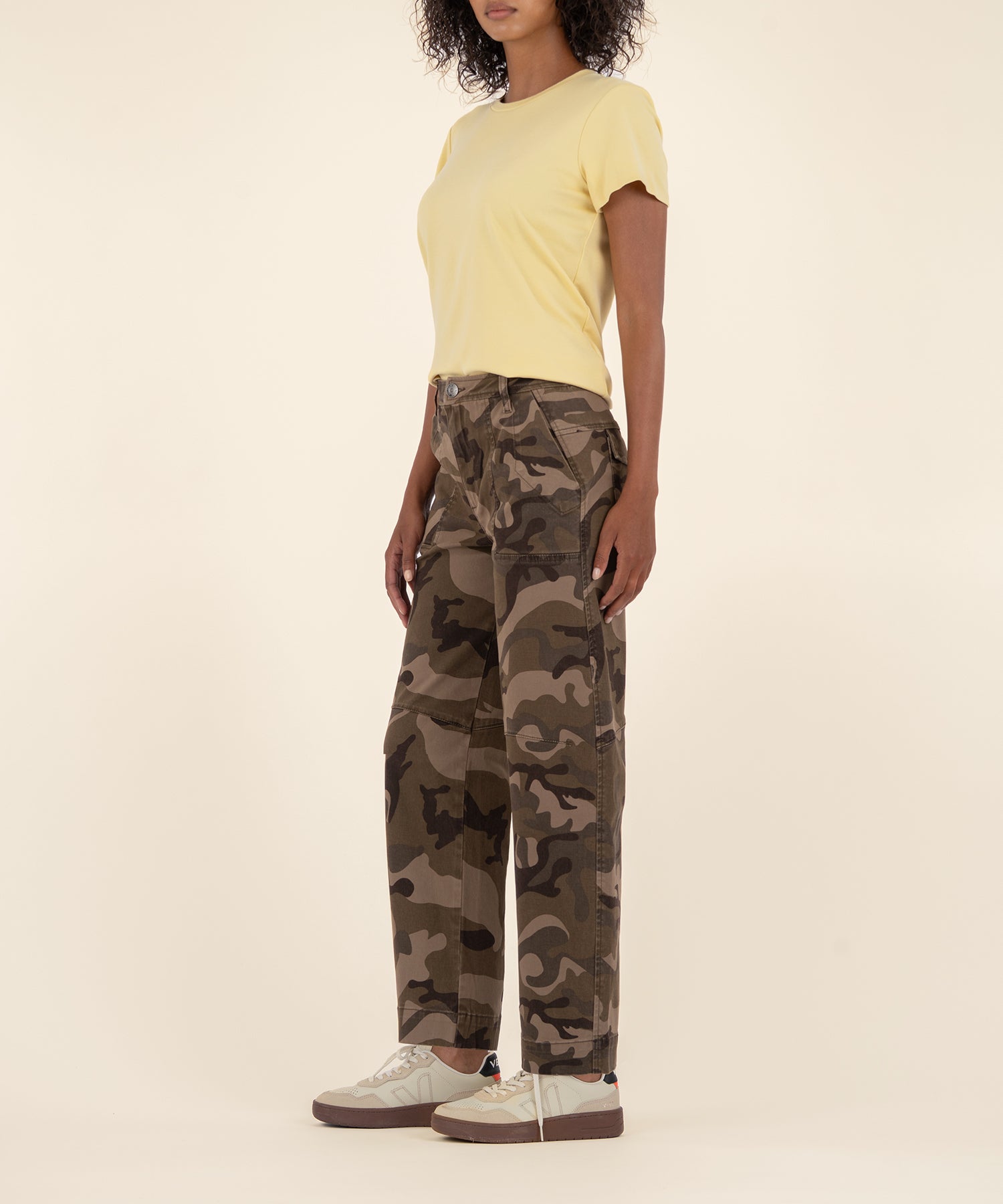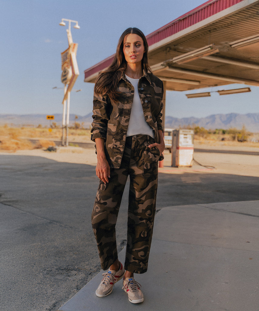 - Make a statement in these high-rise, wide barrel-leg jeans featuring a bold camo print. With a touch of stretch for all-day comfort, they blend standout style with an effortlessly relaxed fit that is flattering on all body types.