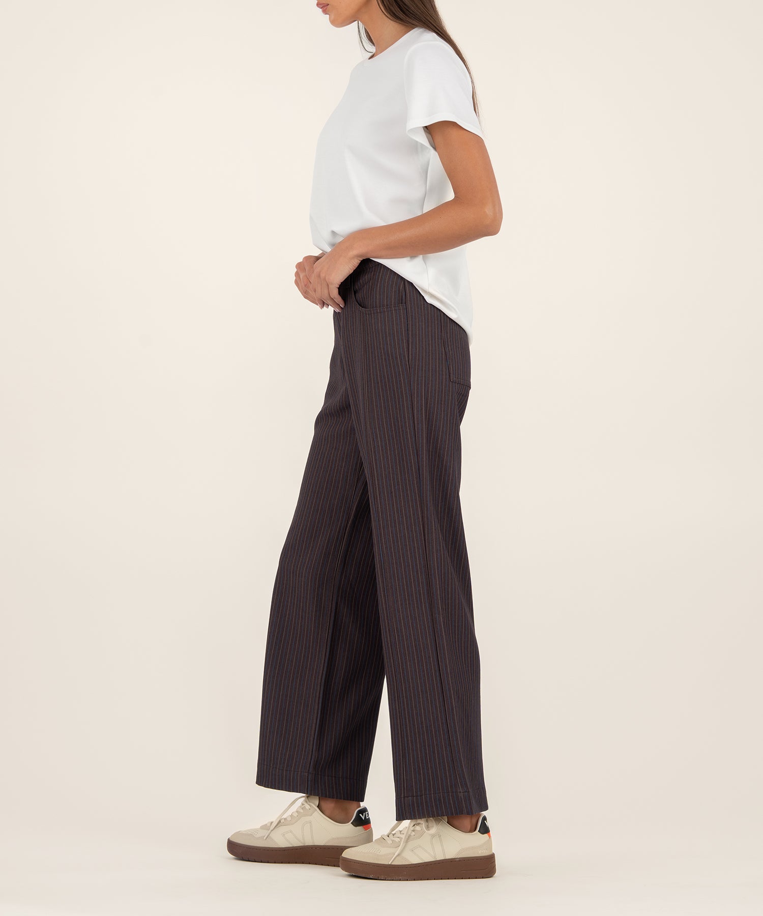 - Elevate your look with these high-rise wide-leg pants in a rich chocolate color, featuring subtle stripes for a touch of sophistication and timeless style.