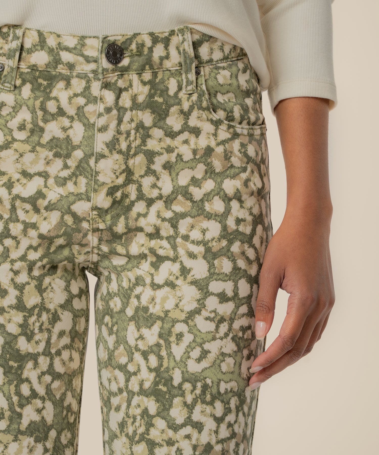 - Stand out in these high-rise ankle flare pants, featuring a bold animal print in rich dark olive tones for a modern, fashion-forward edge. Designed with classic front and back pockets for everyday functionality, they balance practicality with trend-driven appeal. The high-rise fit flatters the waist, while the ankle flare adds a sleek, leg-lengthening finish—making these pants a statement-making addition to any wardrobe.