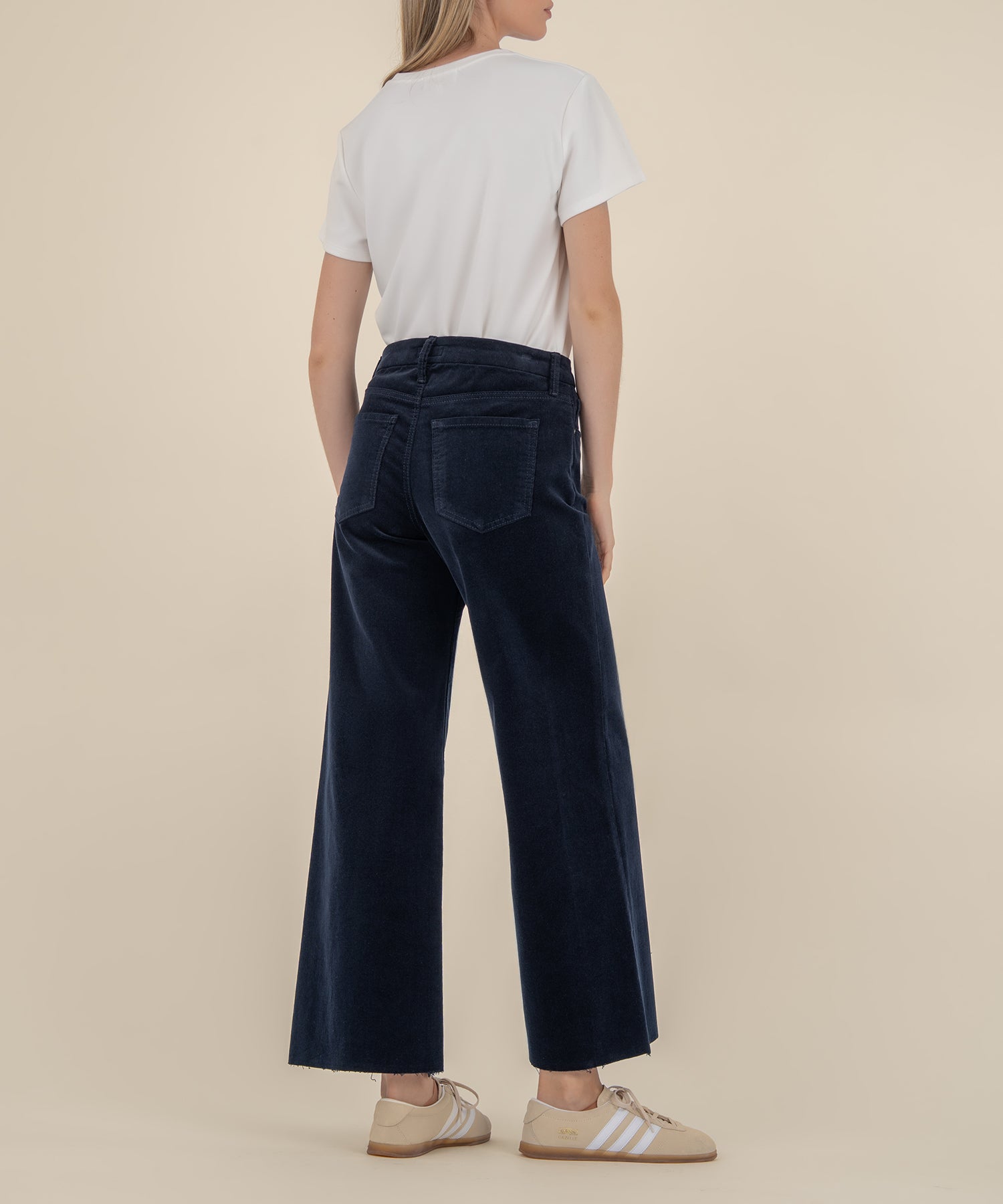 - Step into effortless style with these high-rise wide leg corduroy pants, featuring Fab Ab for a smoothing fit and a trendy raw hem. Crafted with a long inseam and a touch of stretch, they combine comfort with a modern, flattering silhouette. Perfect for making a statement in any season.