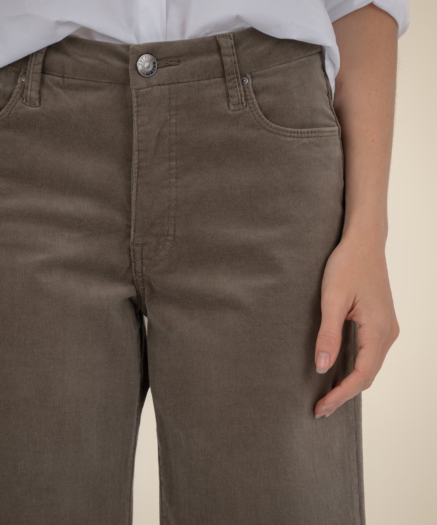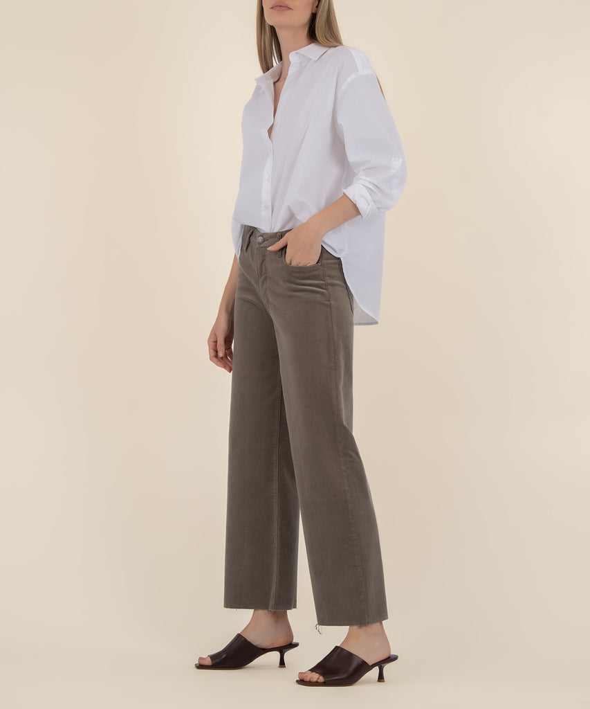 - Step into effortless style with these high-rise wide leg corduroy pants, featuring Fab Ab for a smoothing fit and a trendy raw hem. Crafted with a long inseam and a touch of stretch, they combine comfort with a modern, flattering silhouette. Perfect for making a statement in any season.