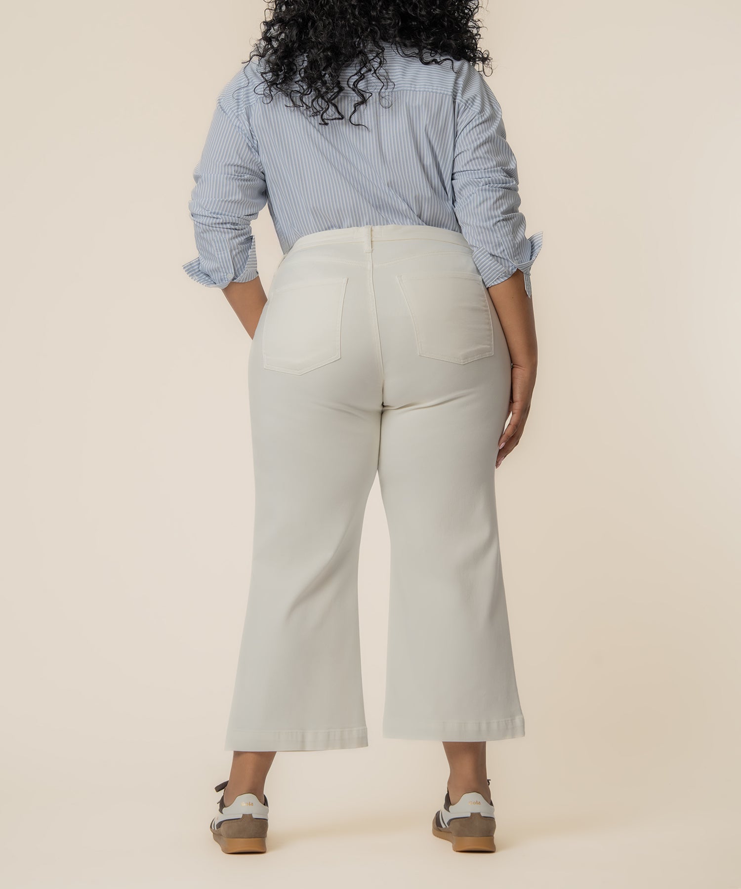 - High-rise jeans in a soft ecru hue, designed with a flattering wide-leg silhouette and a shorter inseam for a perfectly proportioned fit. Featuring front patch pockets and a clean regular hem, they blend classic design with modern ease. Crafted from stretchy material, these jeans offer comfortable movement while maintaining a polished, structured look.