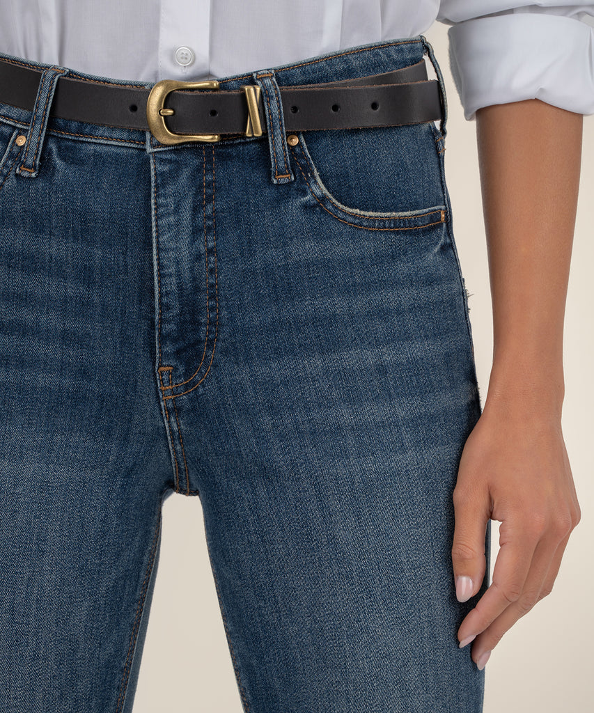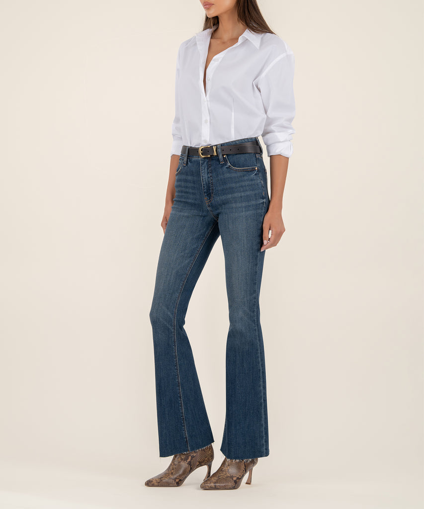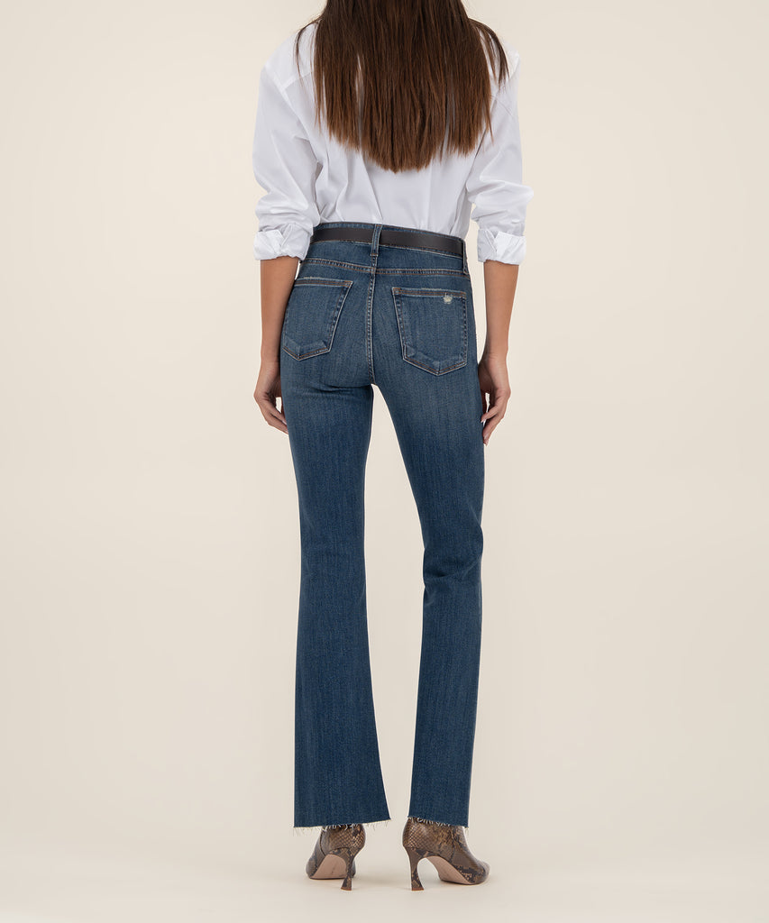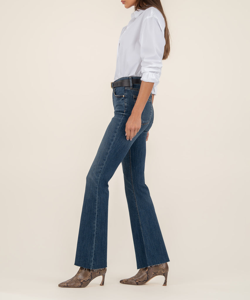 - Slightly flared legs with raw hems designed in stretch-denim jeans with our Fab Ab front pockets that smooth and add comfort making these an all-time favorite.