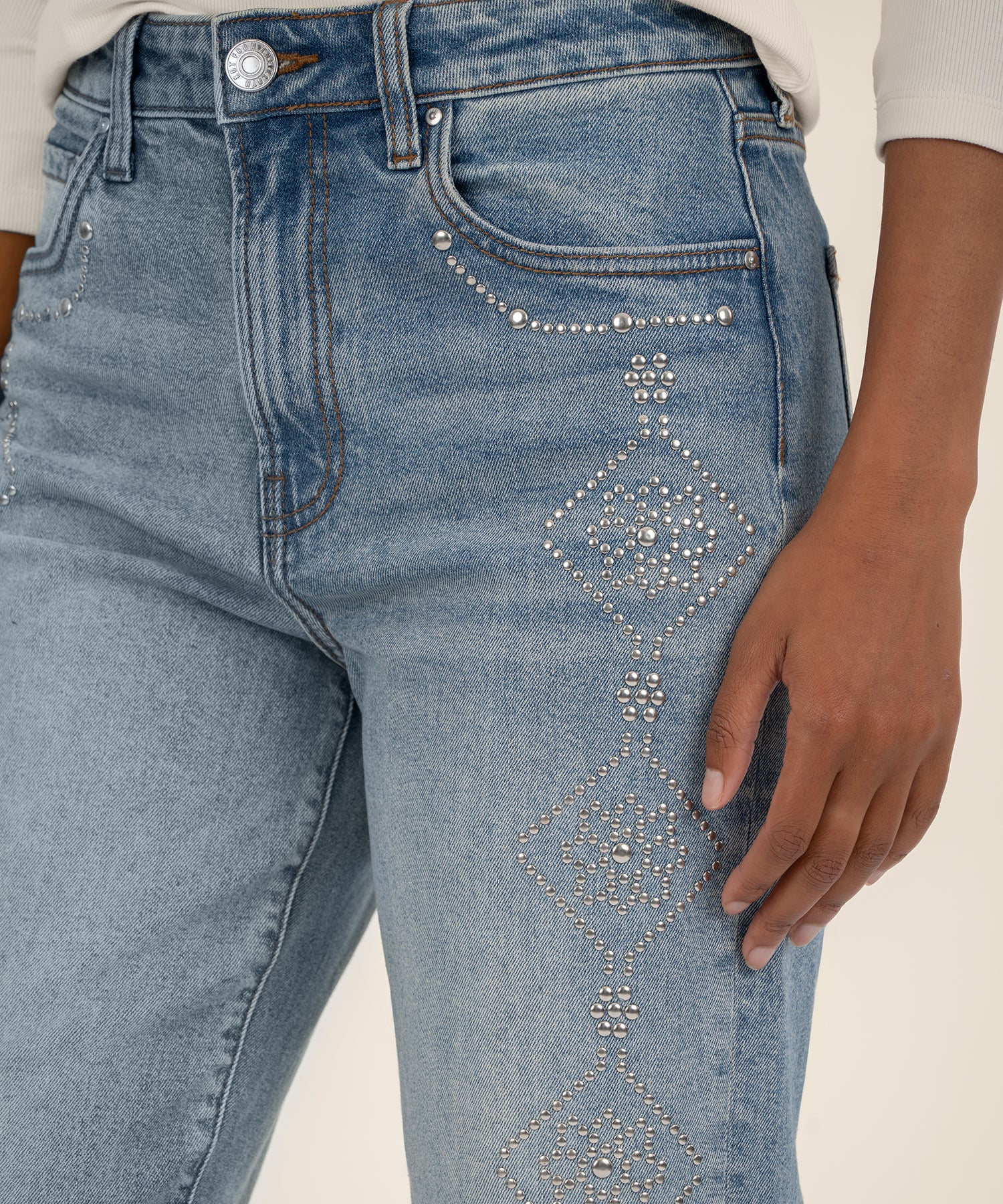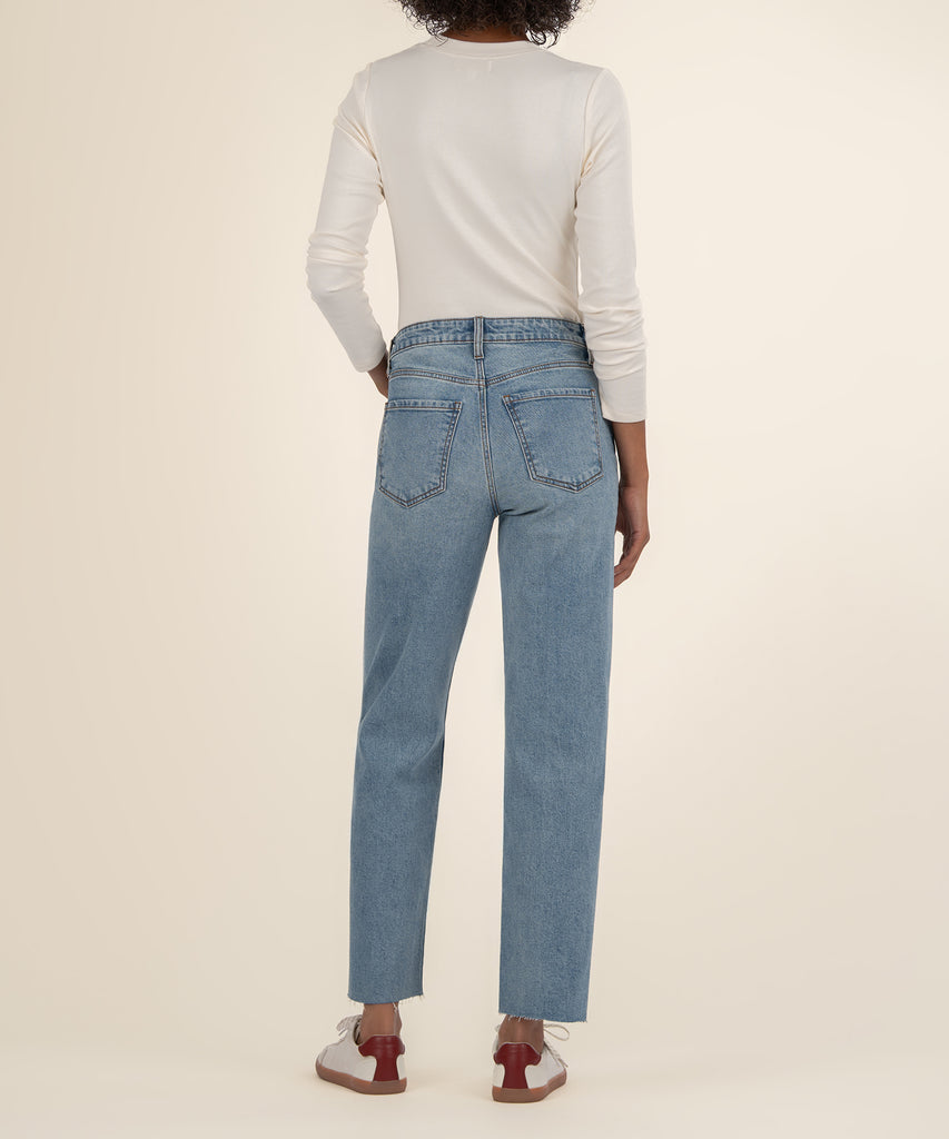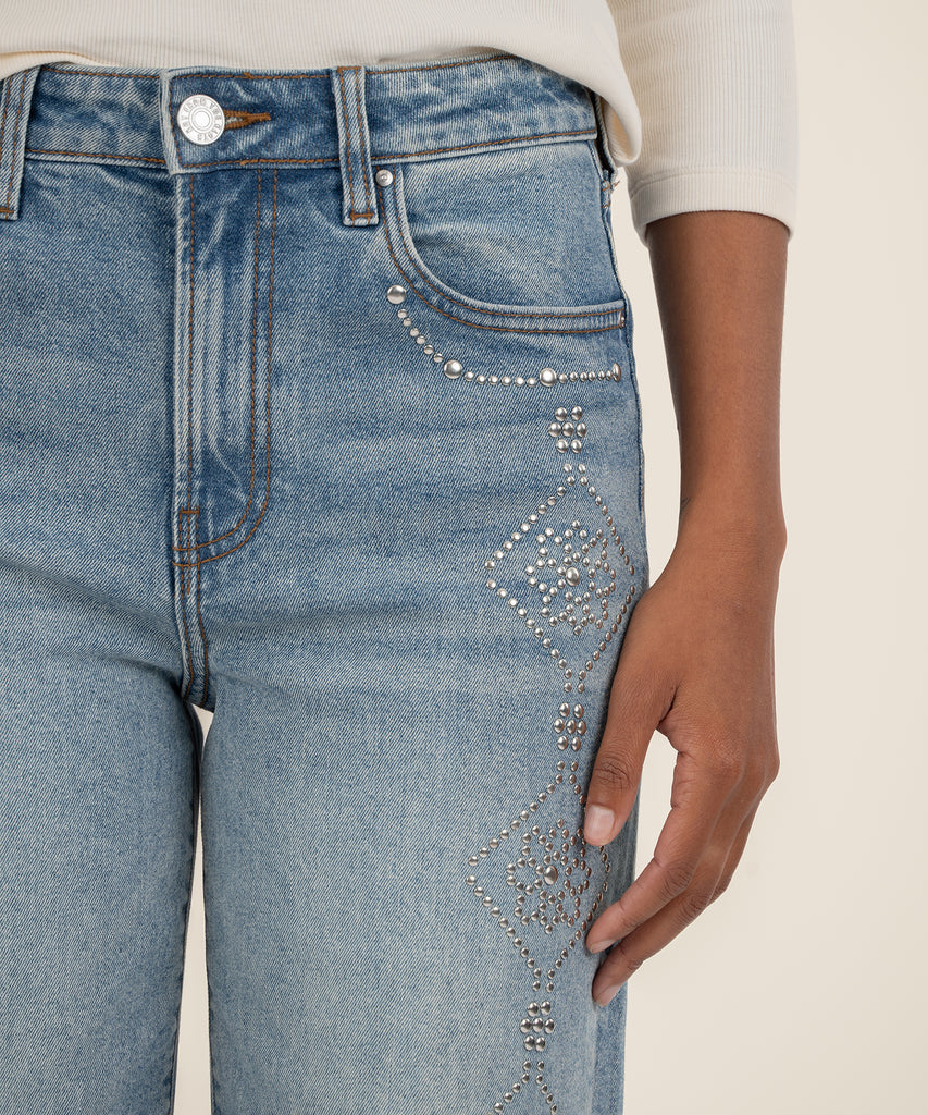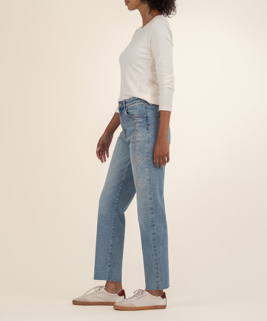 - High Rise Ankle Straight jeans in a medium wash, made from stretchy material for all-day comfort. Finished with heat seal stones along the pockets and side seams for a subtle, stylish sparkle.