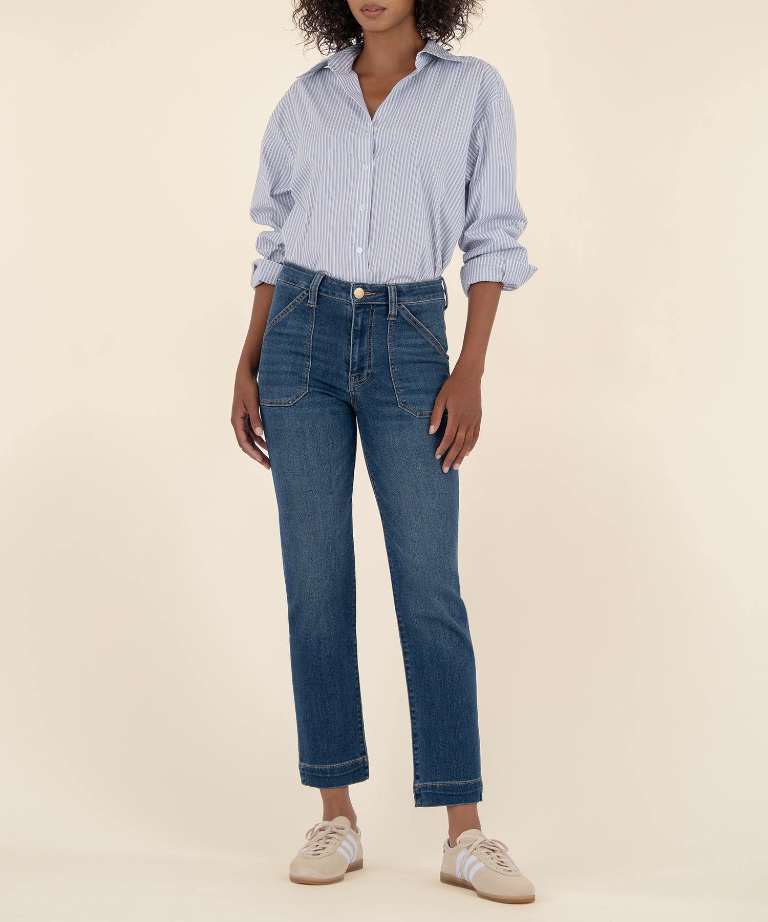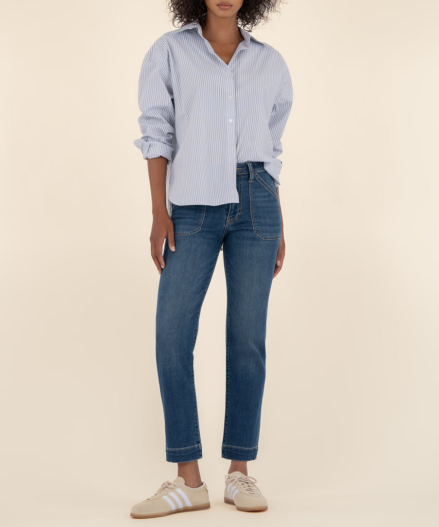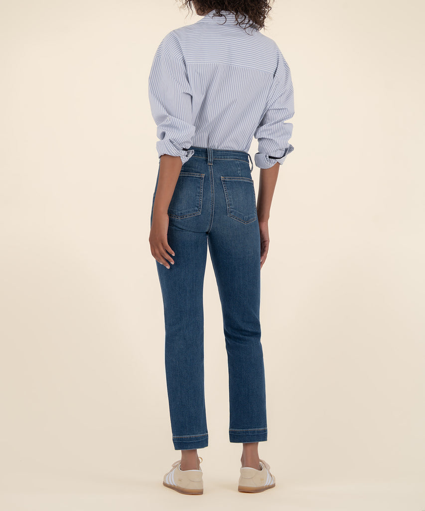- These high-rise, straight-leg jeans bring a fresh twist with retro-inspired porkchop pockets and a sleek dark wash. Made from super stretchy material, they offer a comfortable fit with standout style.