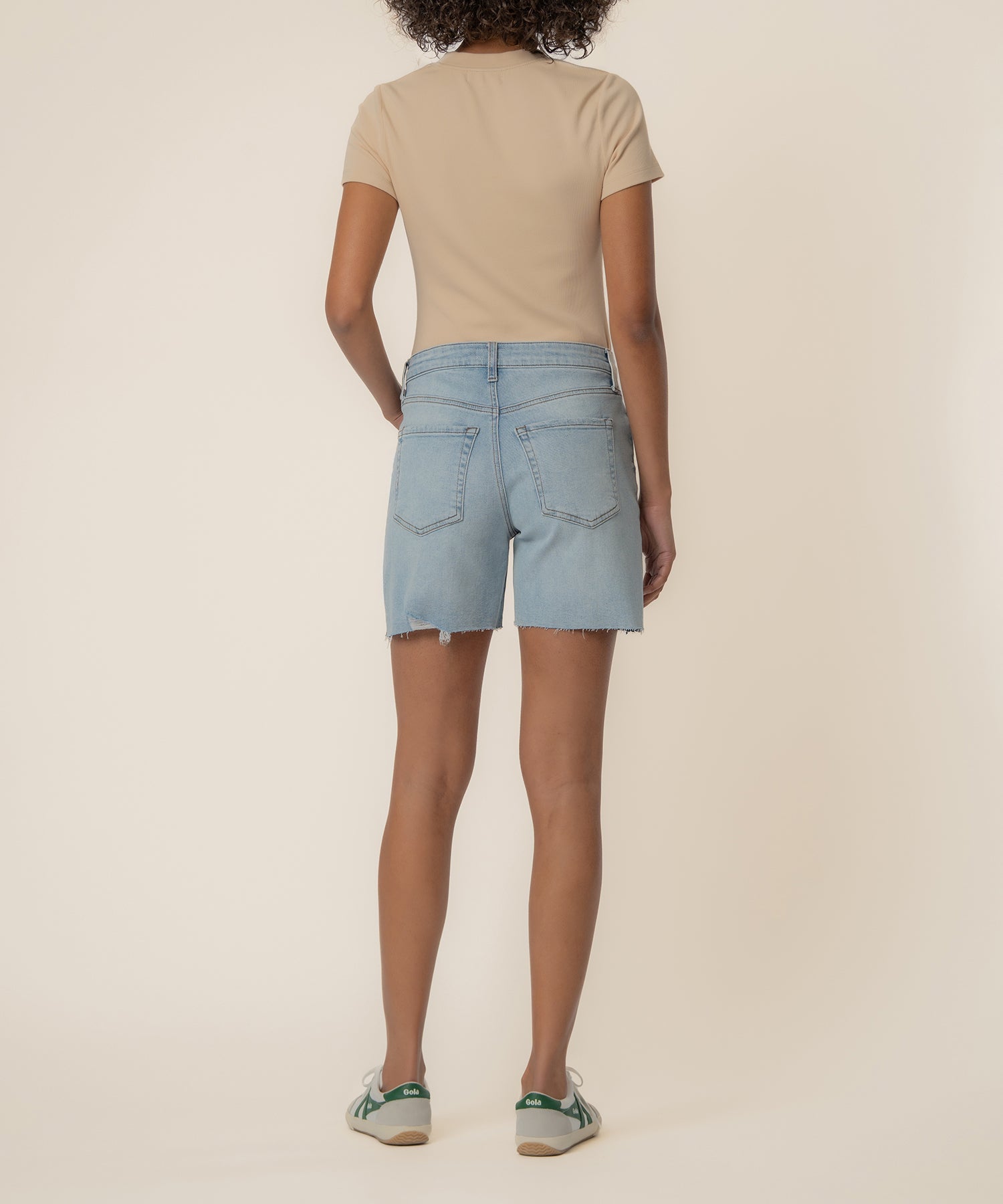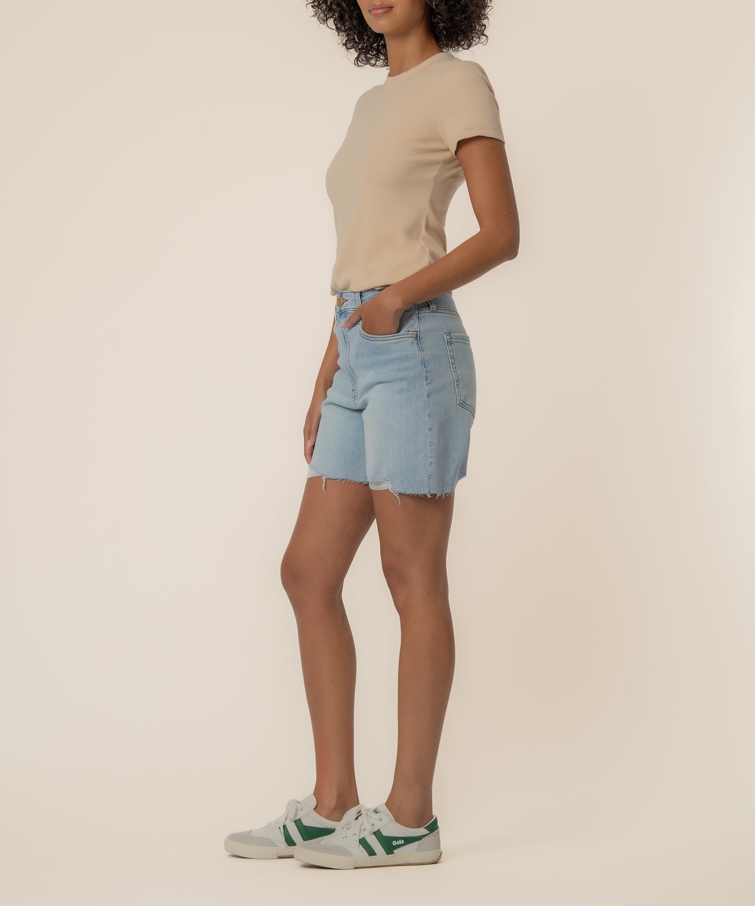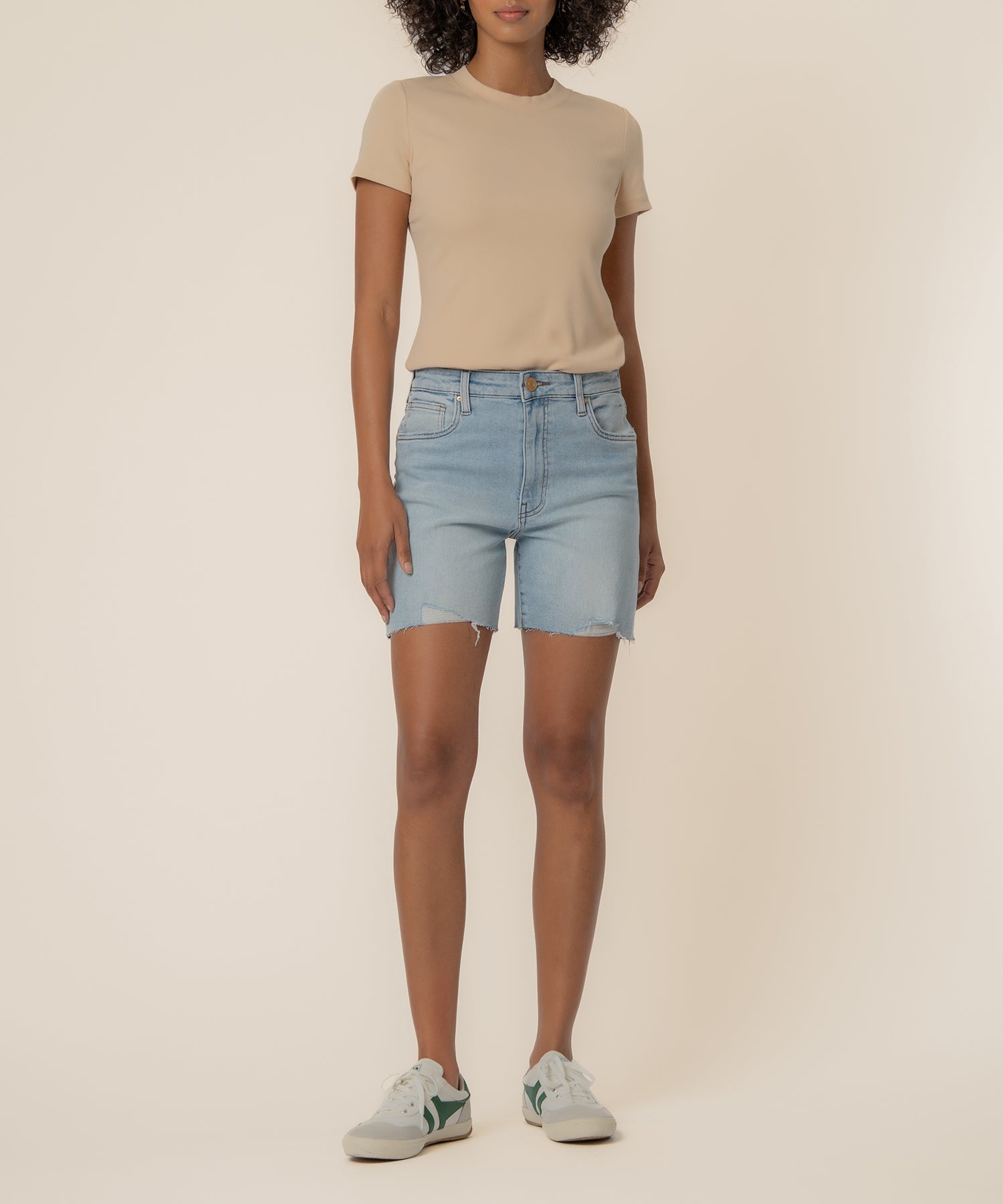 - Perfect for laid-back days, these high-rise shorts combine comfort and casual style. Featuring a raw hem for an effortless, modern finish and crafted from slightly stretchy fabric, they offer a flattering fit without compromising ease of movement. The light wash gives them versatile, everyday appeal, making them a go-to choice for relaxed, warm-weather outfits.