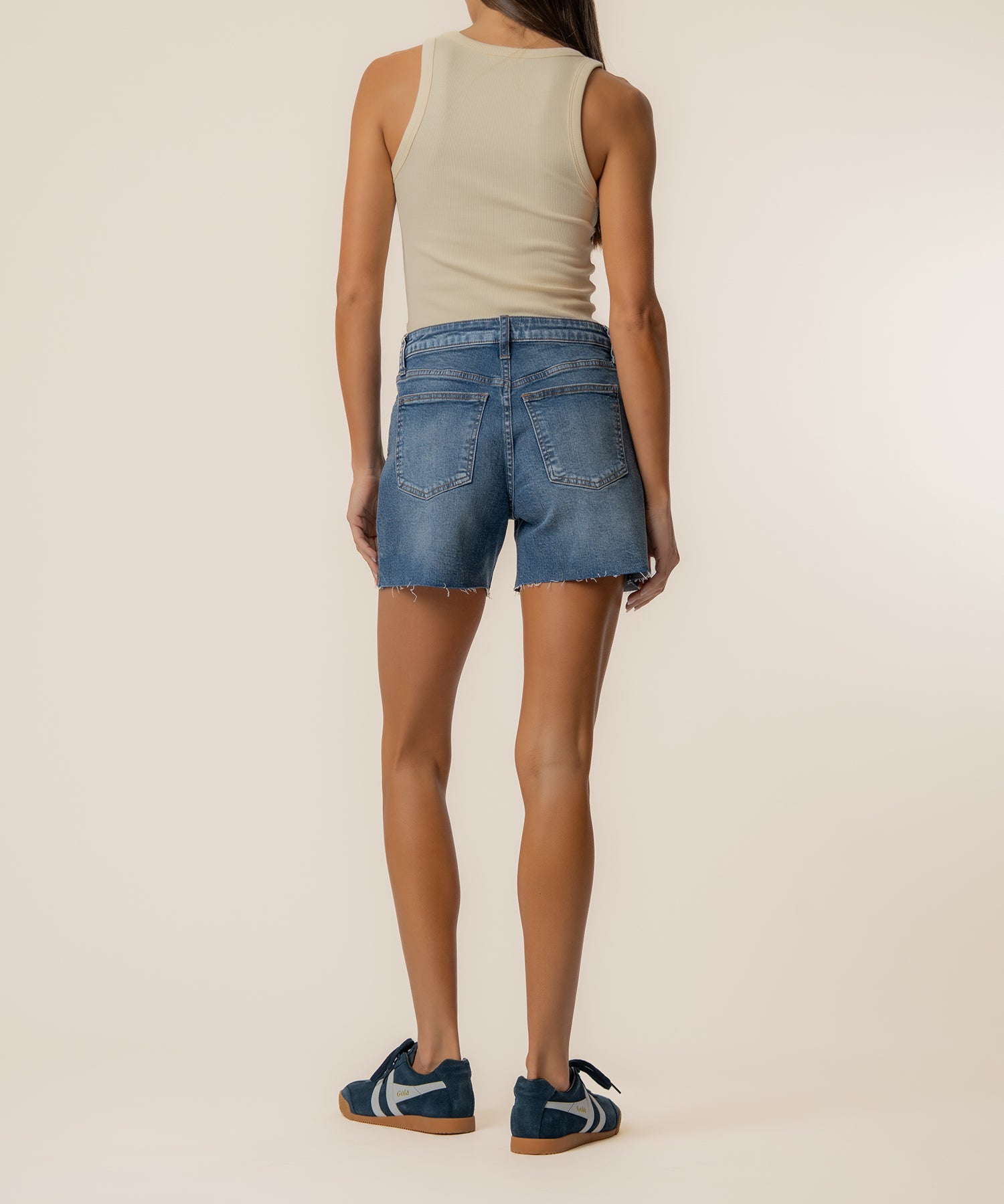 - These high-rise long shorts feature a classic medium wash with subtle fading along the thighs for a dimensional, worn-in look. Front creasing adds a tailored touch, while a frayed hem keeps it casual. Made from stretchy material for all-day comfort and easy movement.