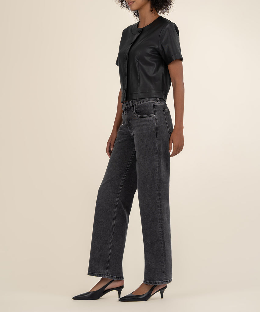 - Designed with a modern coated material, this short sleeve shirt features a clean crew neck and front button closure. A versatile piece you can dress up or down, perfect for statement layering or a polished standalone look.