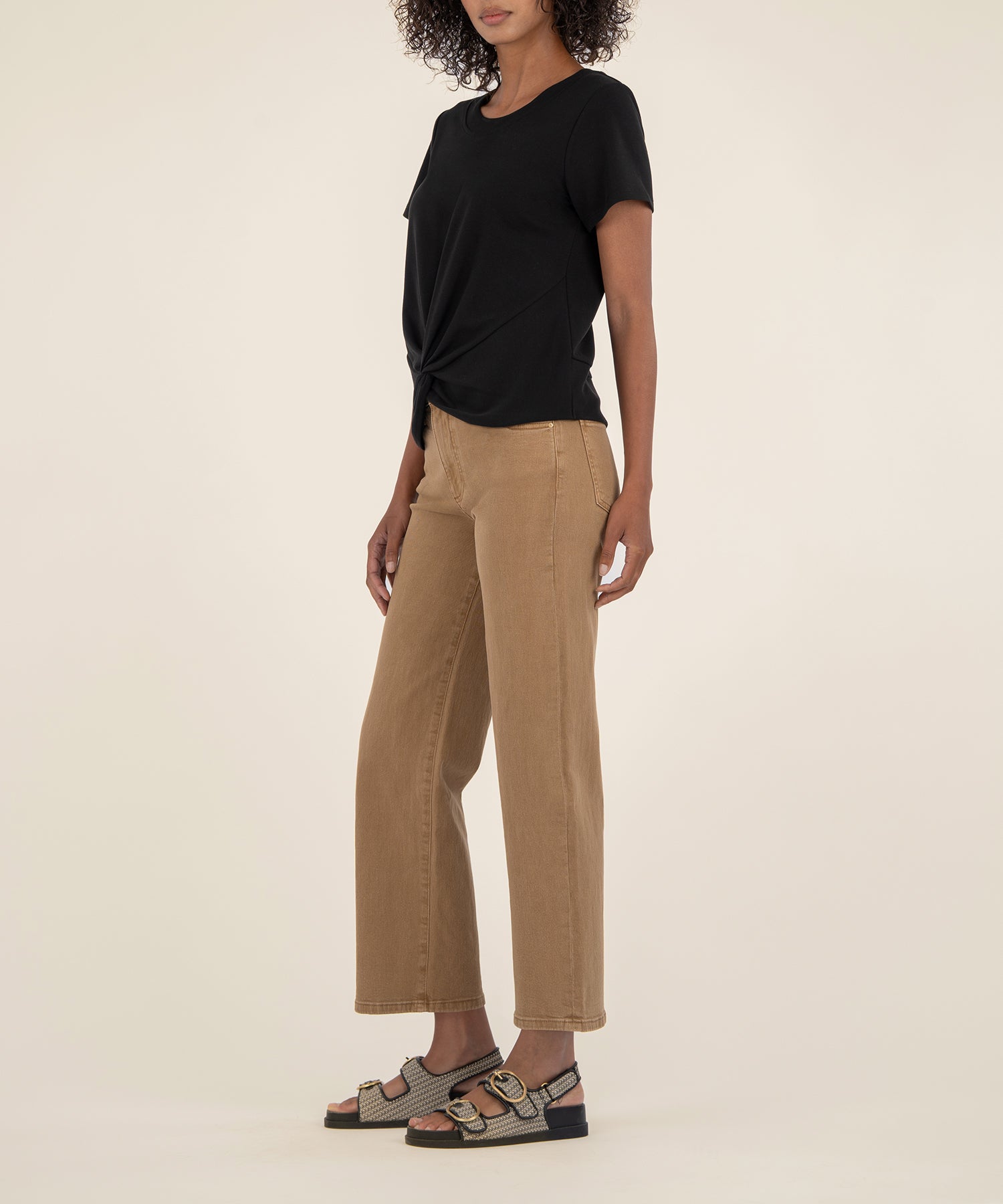 - Keep it casual and chic with this short sleeve crew neck tee, featuring a stylish front twist hem for a flattering, modern touch. Perfect for pairing with high-rise jeans or skirts for an effortless everyday look.