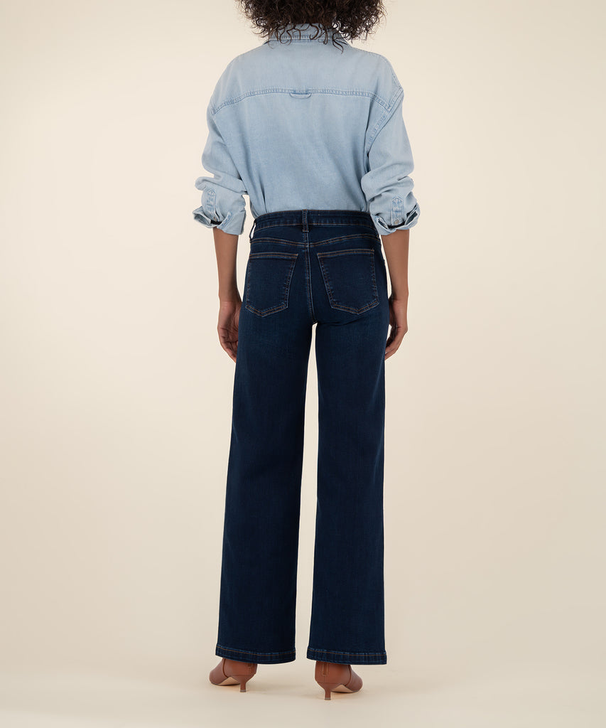 - Elevate your denim collection with these high-rise wide leg jeans in a sleek dark wash, made from stretchy material for all-day comfort. An online exclusive piece, they’re perfect for dressing up or dressing down with effortless style. A versatile essential you’ll reach for again and again.