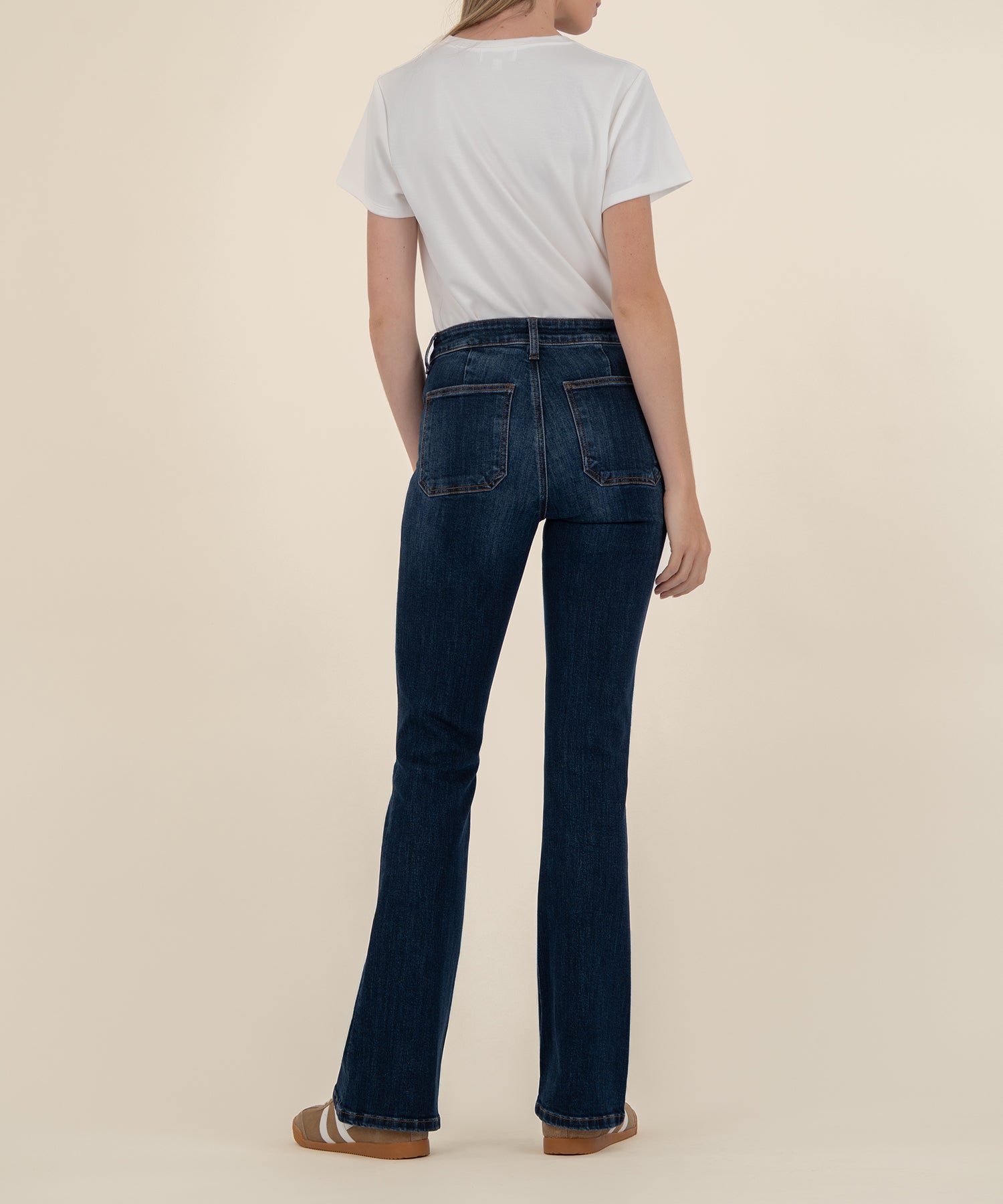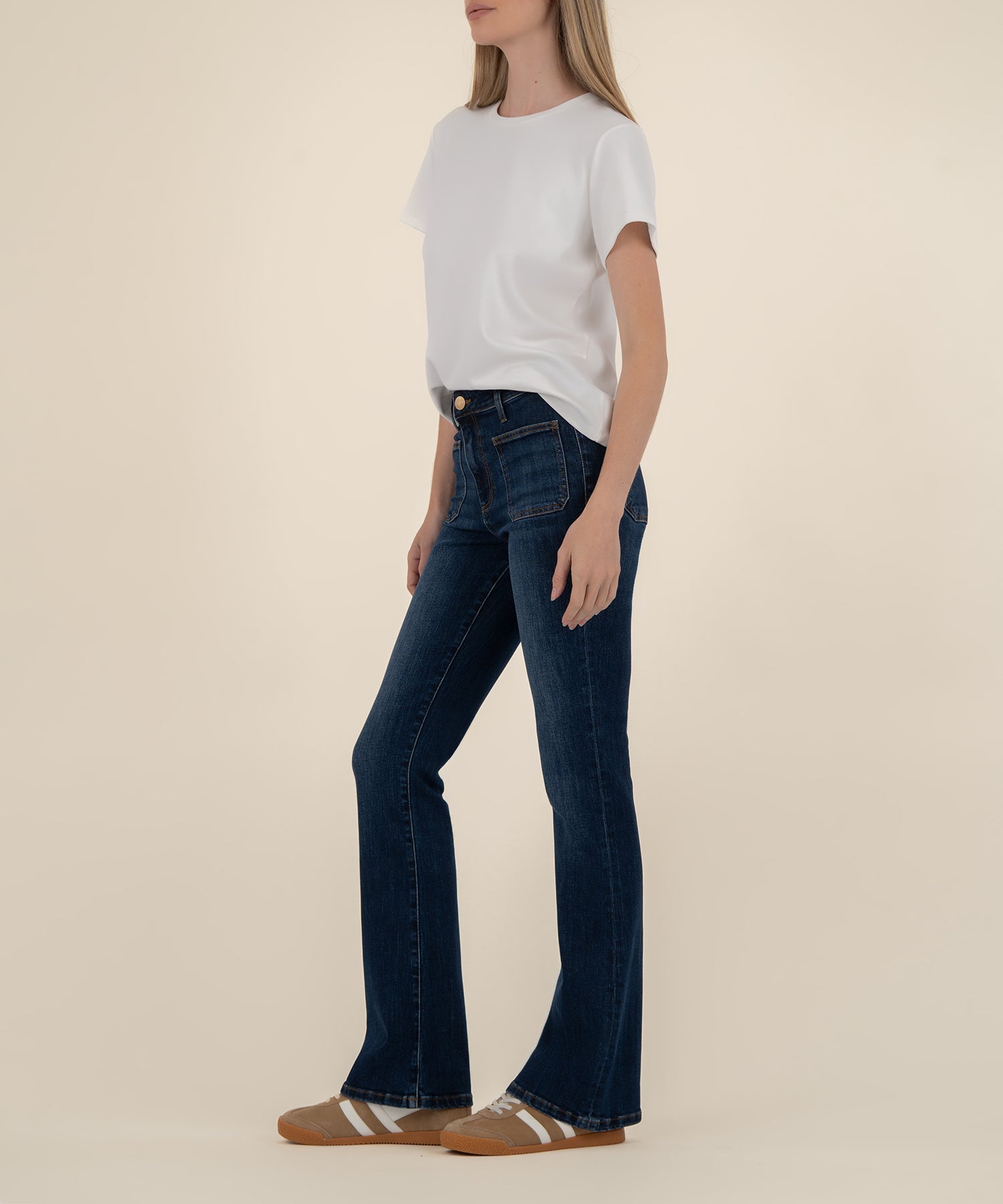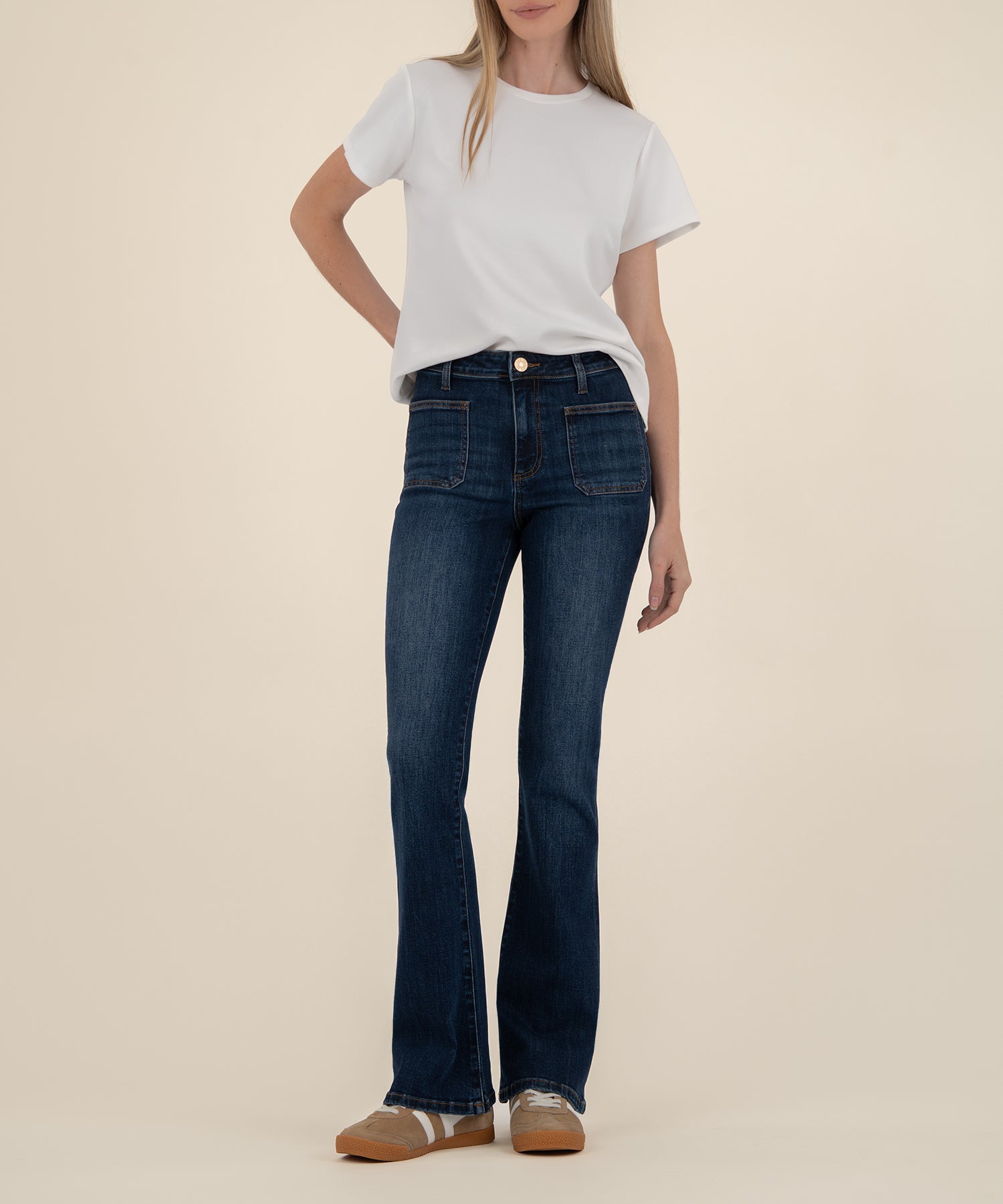 - Patch pockets further the vintage vibes of stretchy, floor-grazing 33" inseam flare jeans made with Fab Ab technology to comfortably flatten and smooth.