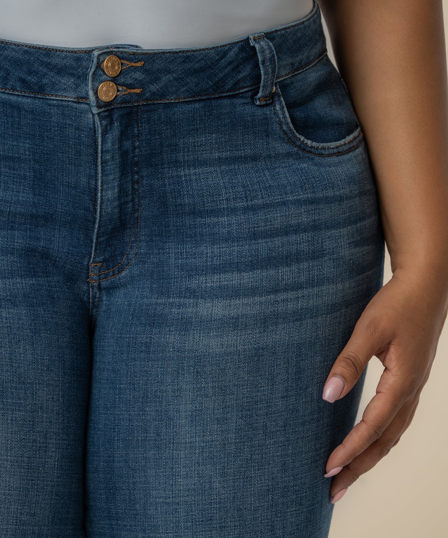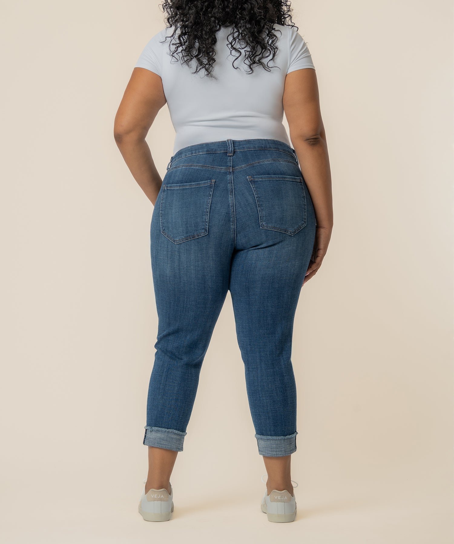 - Mid-rise cropped jeans in a rich dark wash, designed with a clean straight-leg silhouette for a timeless look. Featuring a frayed roll-up hem and a waistband with double-button detailing, they add a casual, lived-in edge. Made from very stretchy material, these jeans offer exceptional comfort and flexibility while maintaining a flattering, easy fit for everyday wear.
