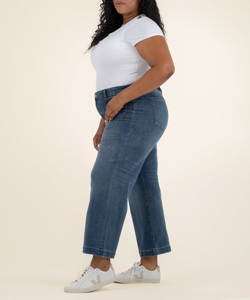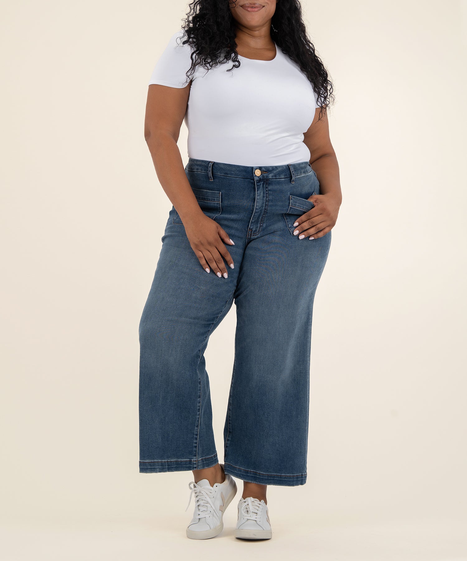 - Upgrade your wardrobe with these chic high rise wide leg jeans in a versatile medium wash color. Featuring stylish patch pockets and a clean hem, they offer a flattering fit and modern silhouette. Perfect for any occasion.