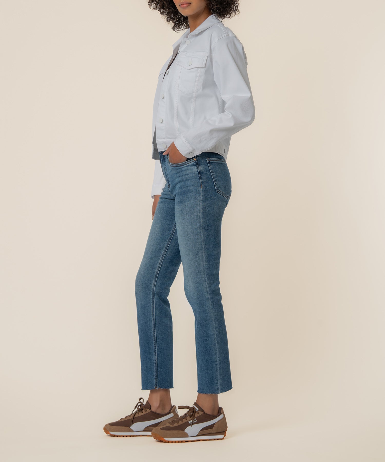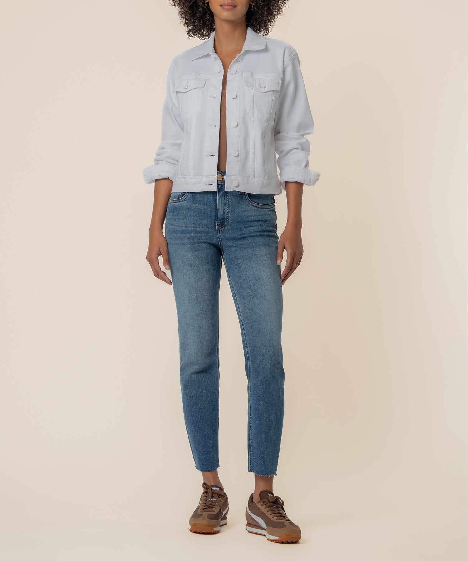 - Upgrade your wardrobe with this stylish optic white jean jacket, perfect for layering year-round. Made with stretchy material, it offers comfort and flexibility without compromising on style. The semi-fit design provides a flattering silhouette that suits all body types. Featuring a sleek front button closure, this jacket adds a clean, timeless touch to any casual outfit.