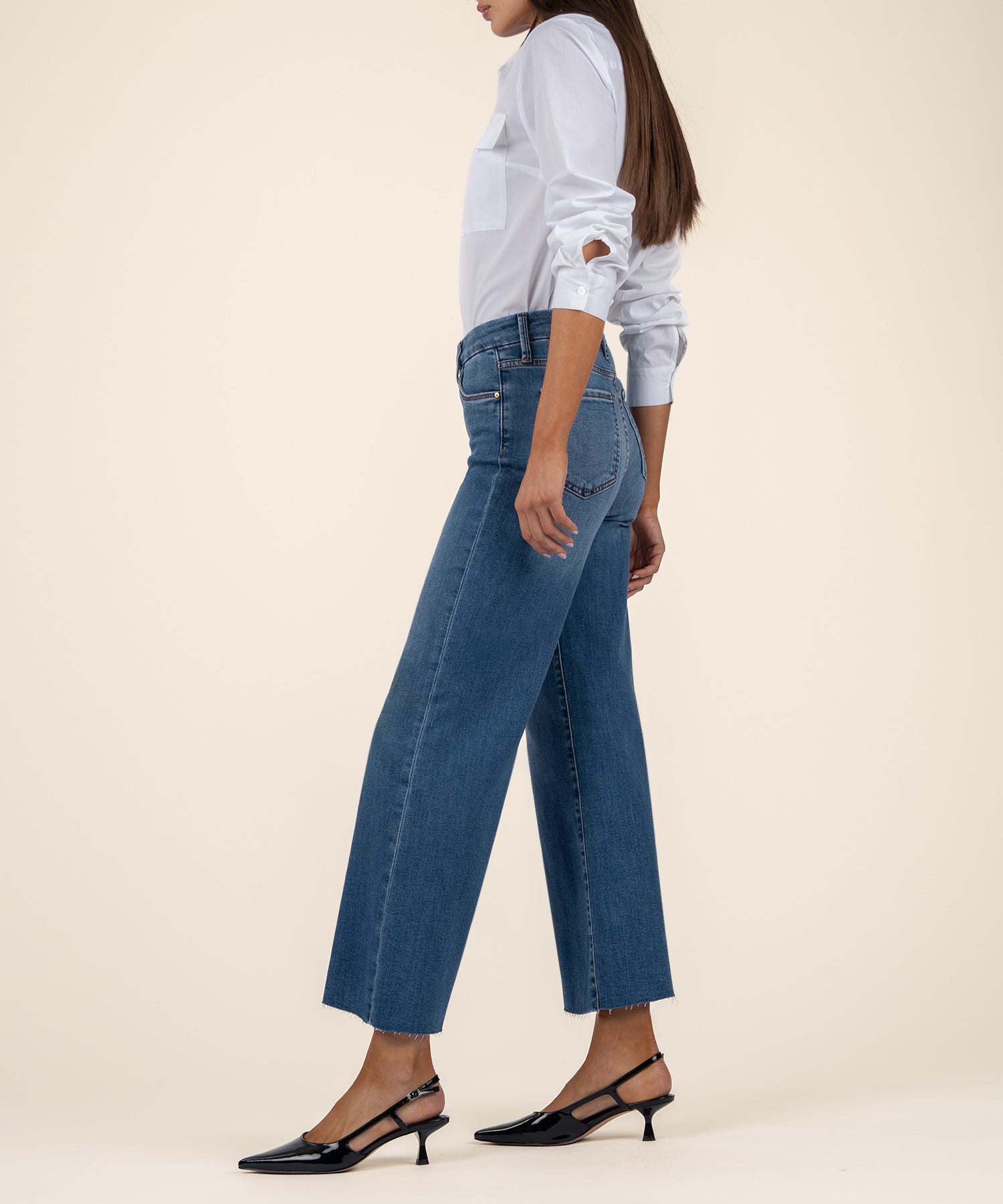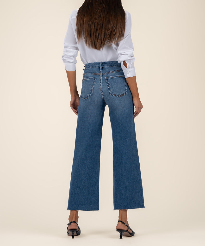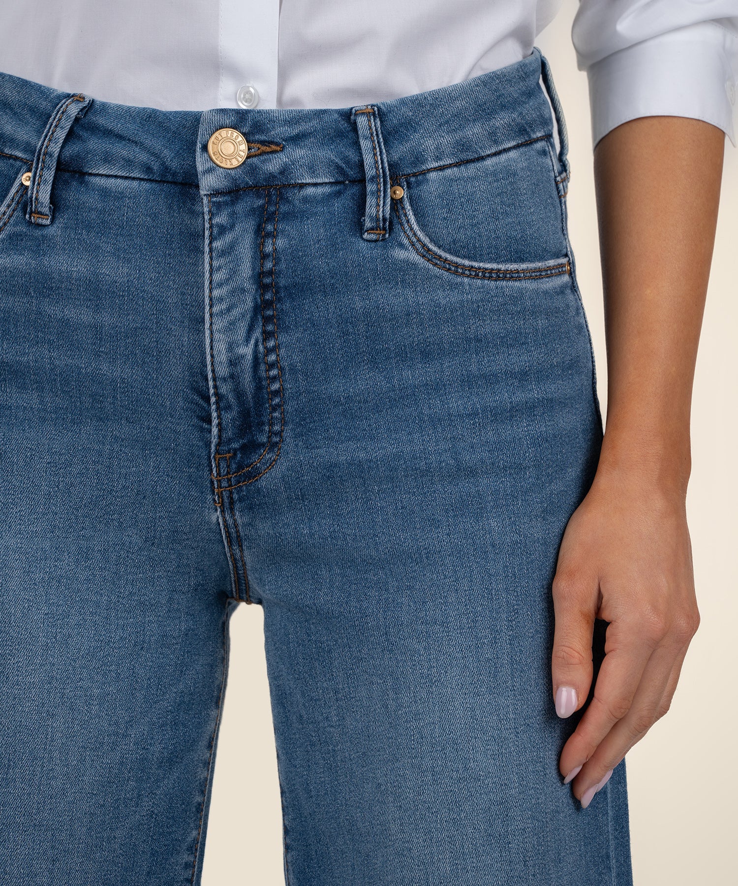 - Rock a throwback look in faded, high-rise wide-leg jeans featuring raw hems and Fab Ab front pockets that comfortably shape and slenderize in a soft stretch fabric.
