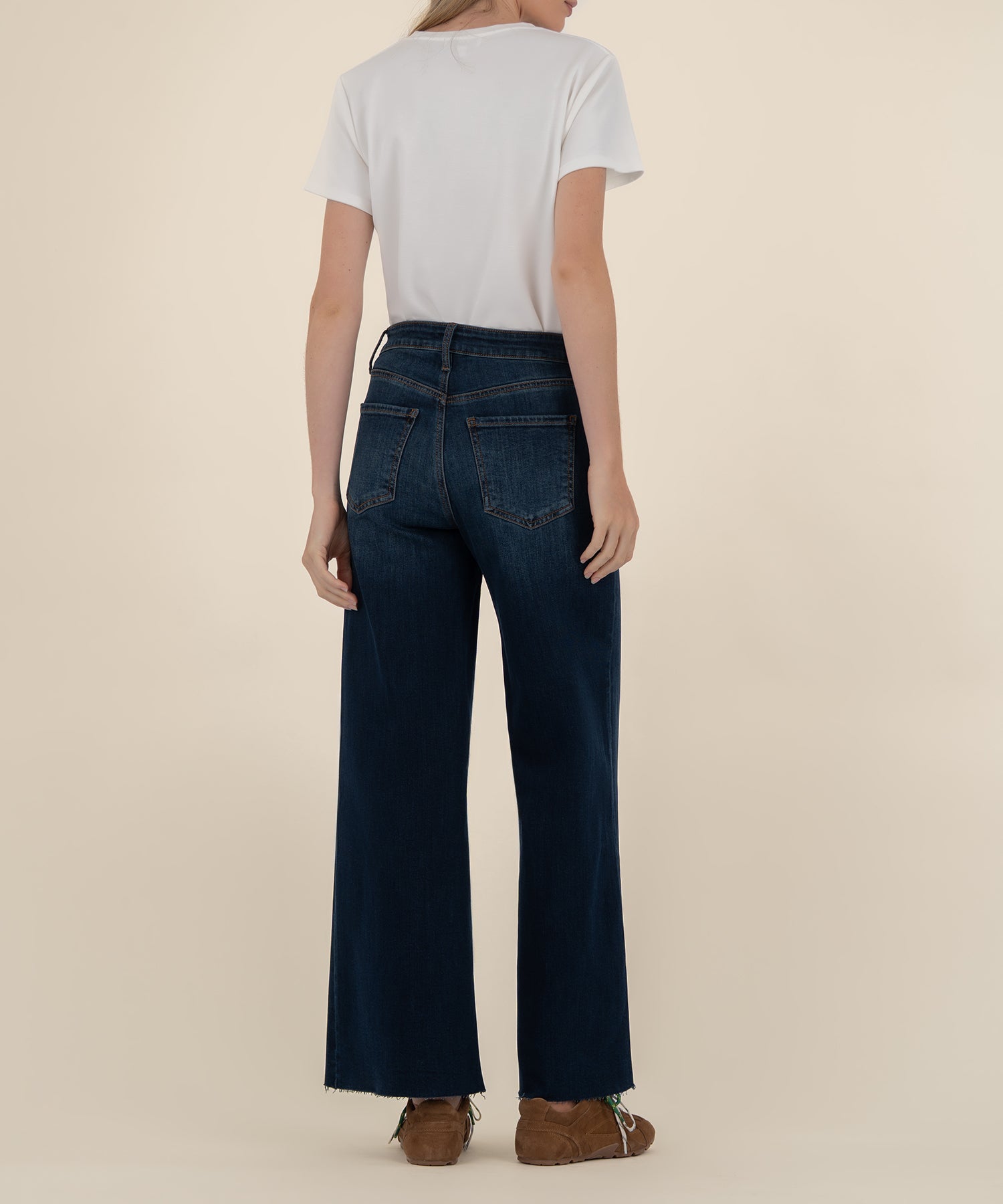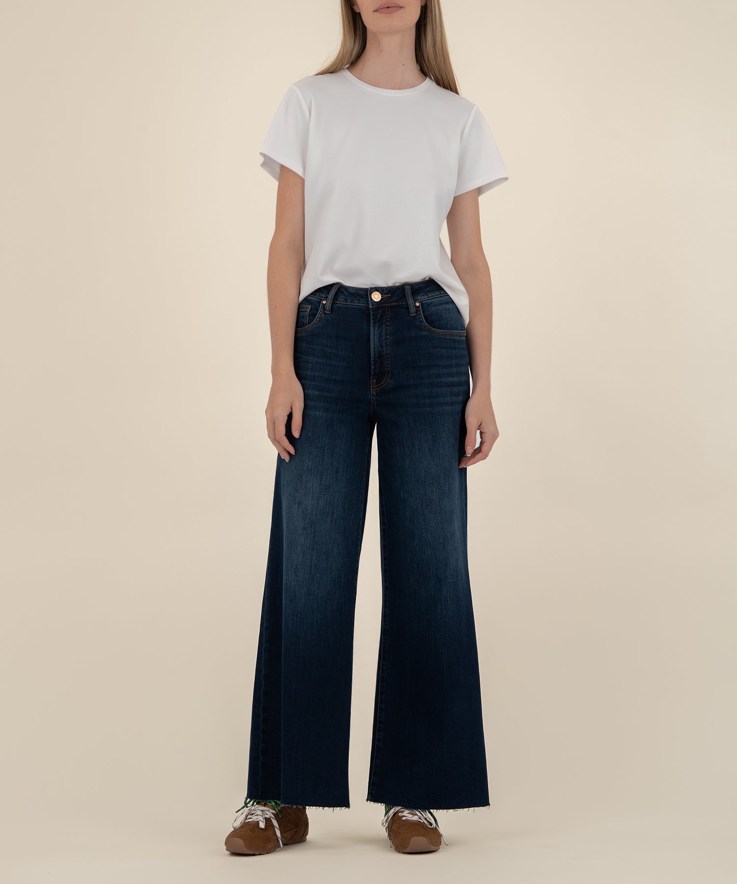- Make a bold statement with these high rise super wide leg jeans in a rich dark wash. Featuring our signature Fab Ab pockets and crafted from stretchy material for ultimate comfort, they’re finished with a trendy raw hem for an effortlessly edgy look.