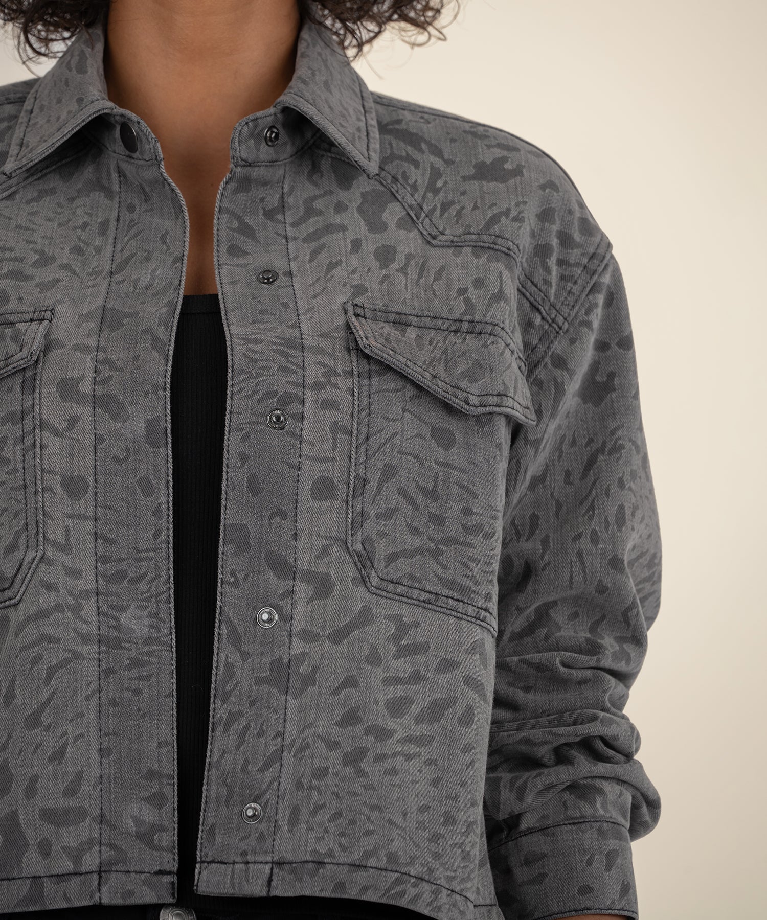 - Wild meets wearable. This animal print jacket in a cool grey shade brings attitude to your outerwear with flap patch pockets, a crisp button-front closure, and just the right amount of stretch for all-day ease. Equal parts fierce and functional — your layering game just leveled up.