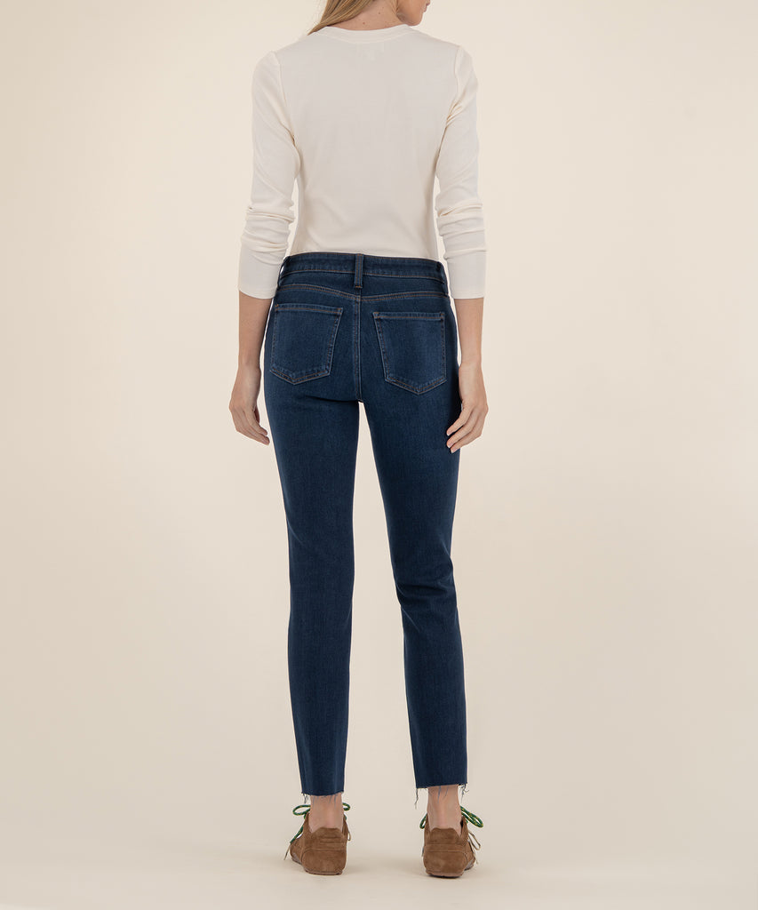 - These high rise jeans feature a flattering ankle-length straight leg and a clean dark wash for a timeless look. Designed with Fab Ab pockets for subtle shaping and made from stretchy material for all-day comfort. Finished with a modern raw hem, they’re the perfect mix of structure and ease.