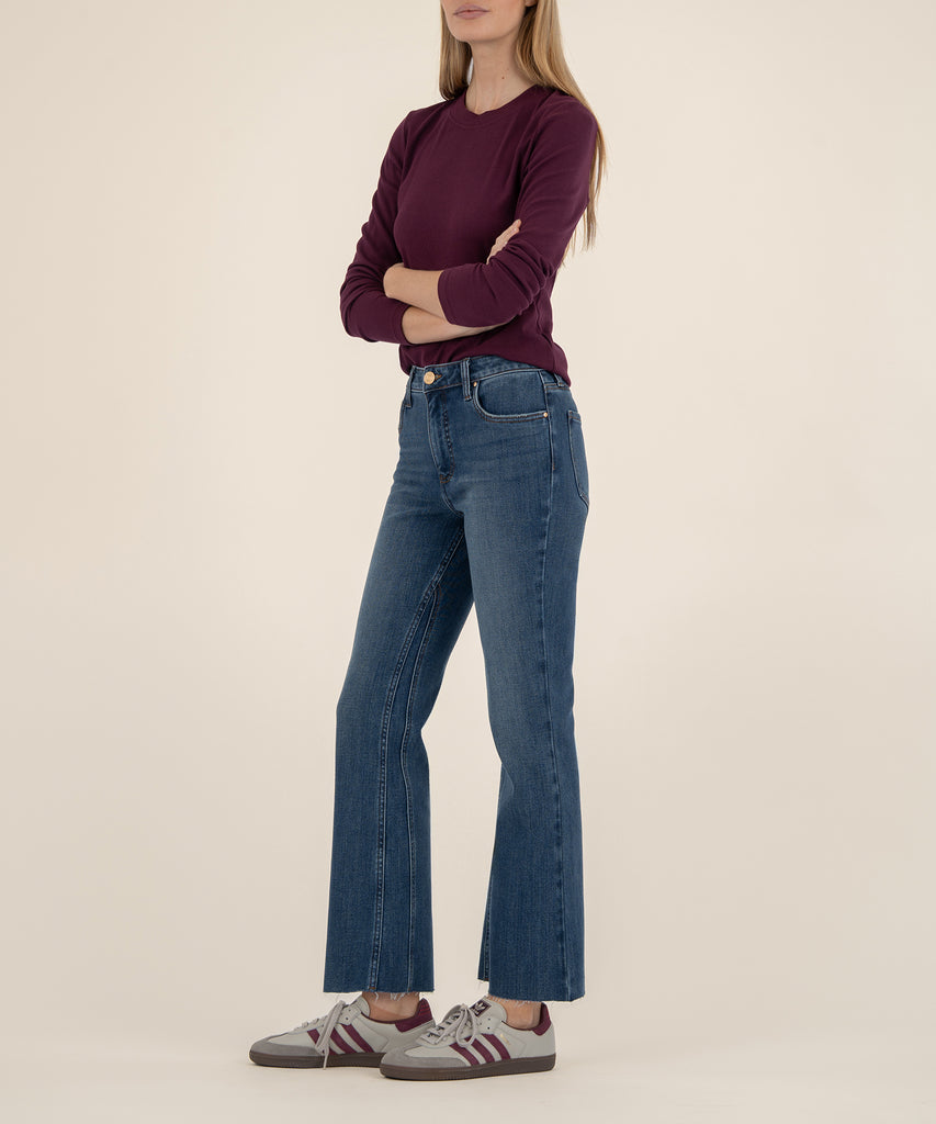- Elevate your look with our high-rise Fab Ab ankle flare jeans in a classic medium wash. Made with super stretchy material and featuring smoothing Fab Ab pockets, these jeans provide comfort and a flattering fit. The stylish ankle flare and unique Nest Leg design add a modern touch to any outfit.