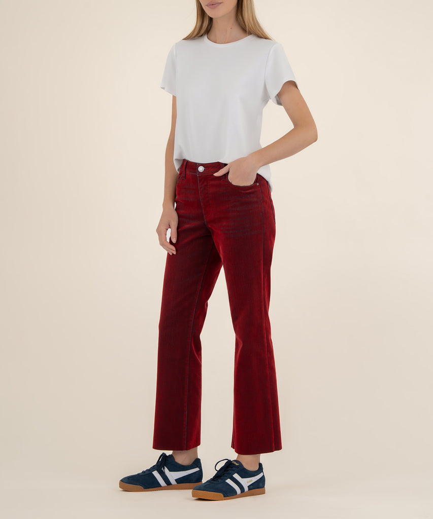 - Elevate your denim game with these high-rise ankle flare jeans, designed to flatter with a subtle kick and a trendy raw hem finish. Crafted from stretch denim with flocking, they offer a soft, flexible fit that moves with you while adding a touch of luxe texture. Featuring the signature Fab Ab Pocket, these jeans smooth and support for a confident, sculpted silhouette.
