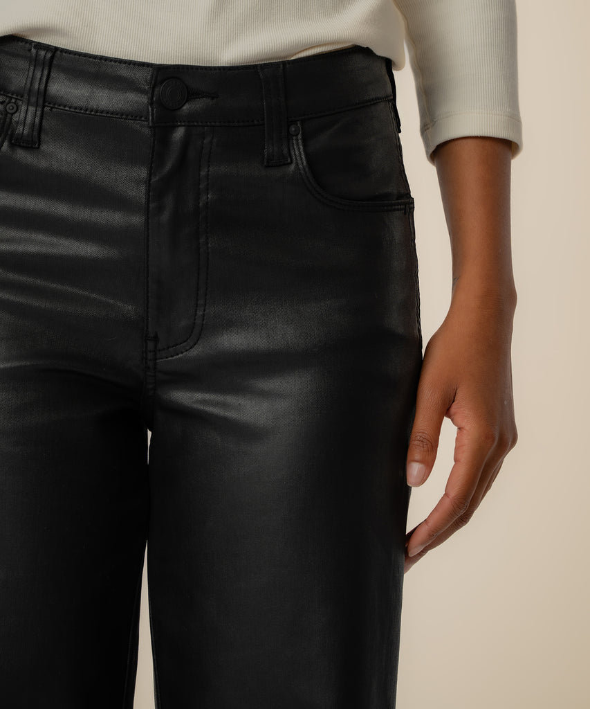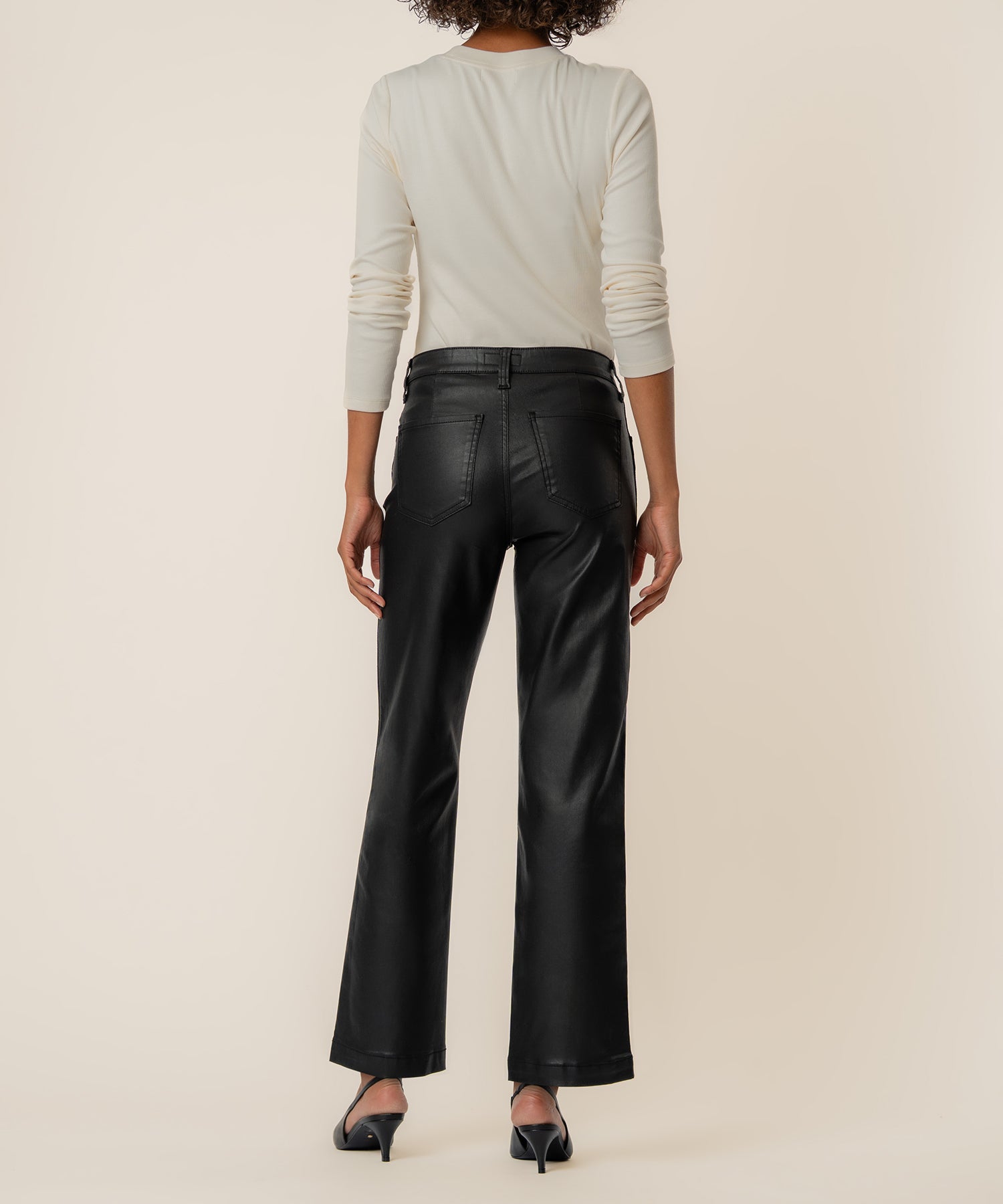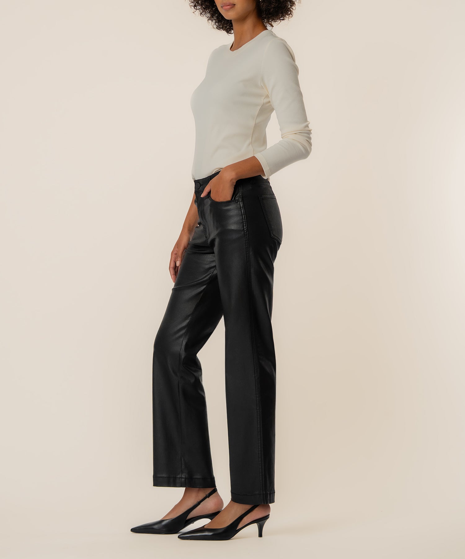 - These high-rise straight-leg pants feature a sleek coated material that adds a modern, polished touch. Perfect to dress up or down, they offer versatile style for any occasion.