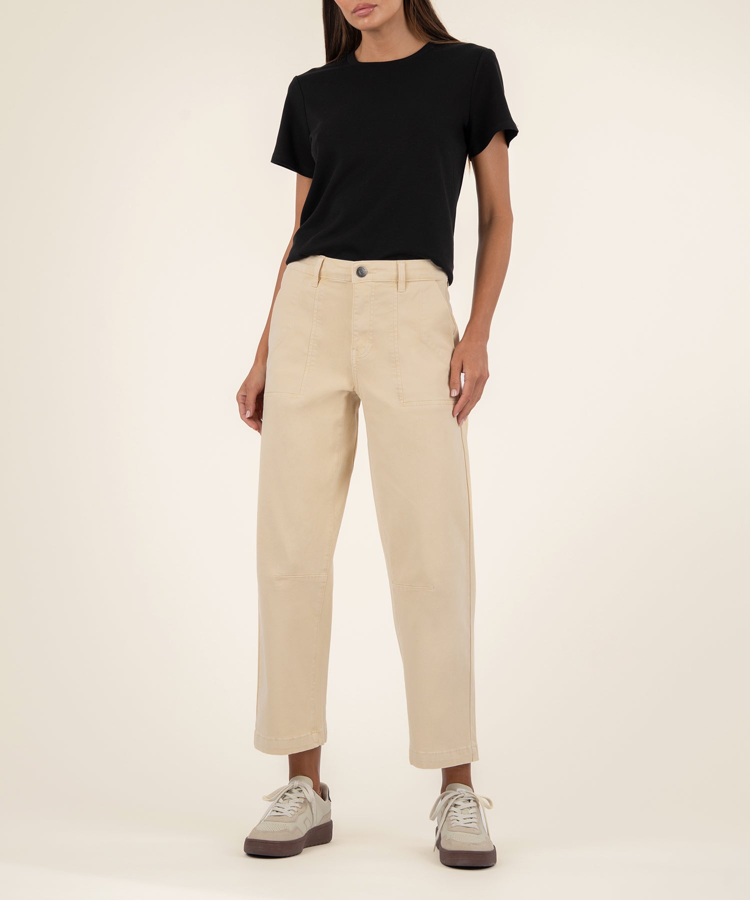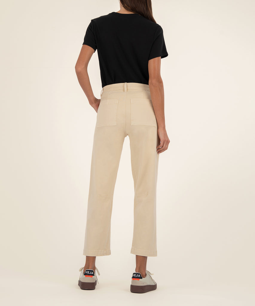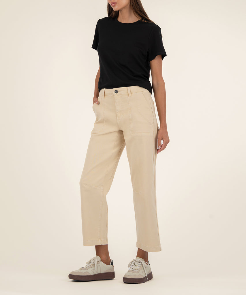 - These high-rise pants in a vibrant kiwi color feature a modern barrel leg silhouette for a structured yet relaxed fit. Finished with classic porkchop pockets, they blend utility-inspired style with fresh color.