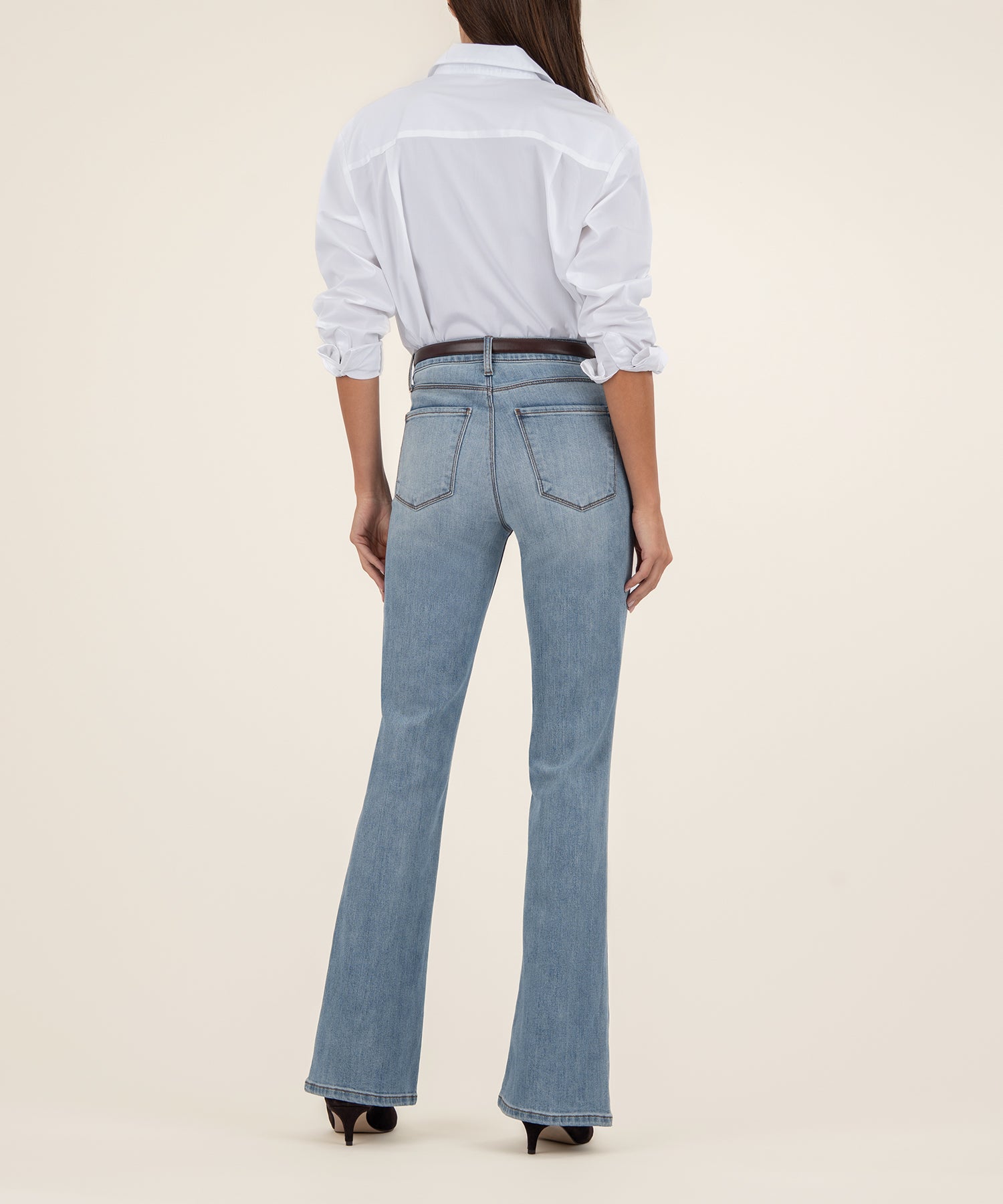 - Elevate your style with these high-rise flare pants featuring Fab Ab fit for a flattering silhouette. Crafted in a medium wash with very stretchy material, they offer all-day comfort and a sleek, trendy look. Perfect for dressing up or down, these pants are a versatile wardrobe essential.