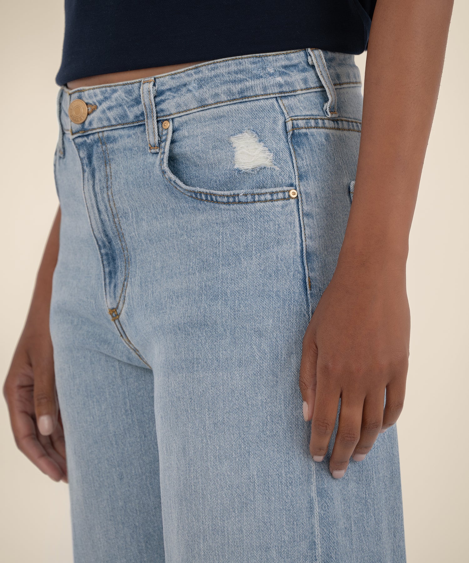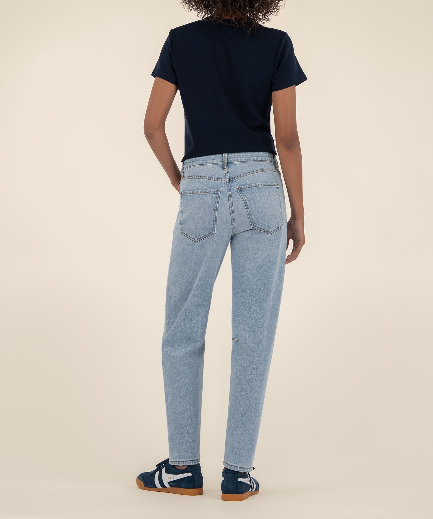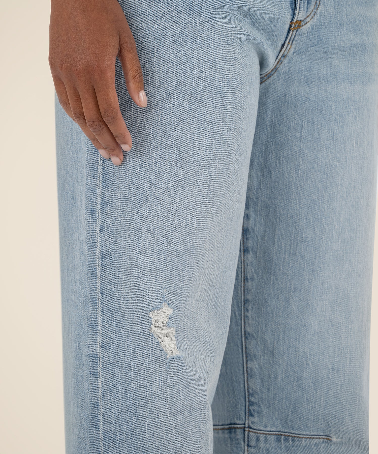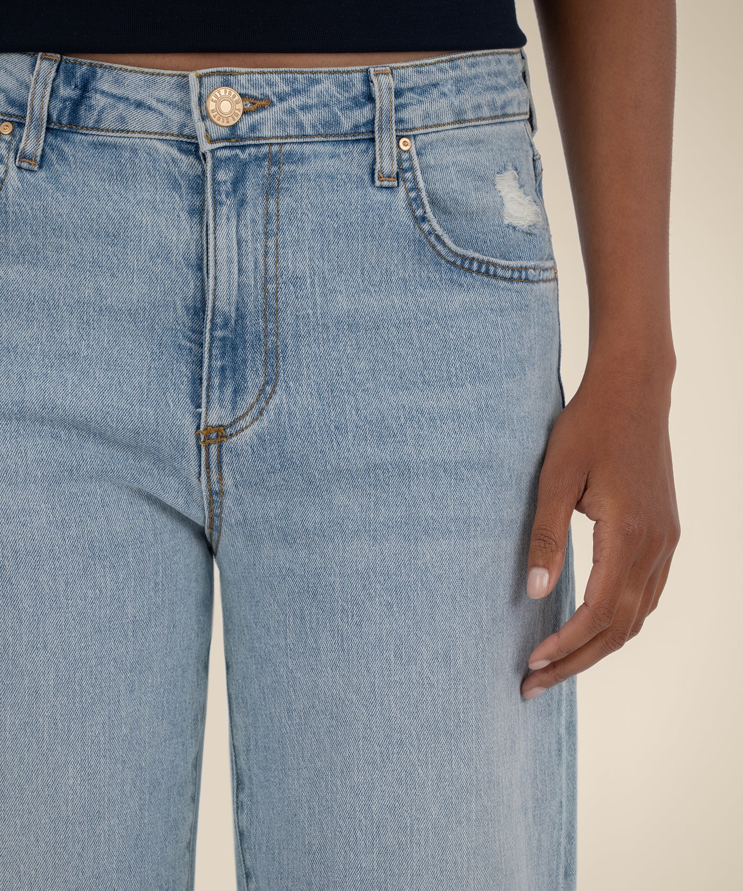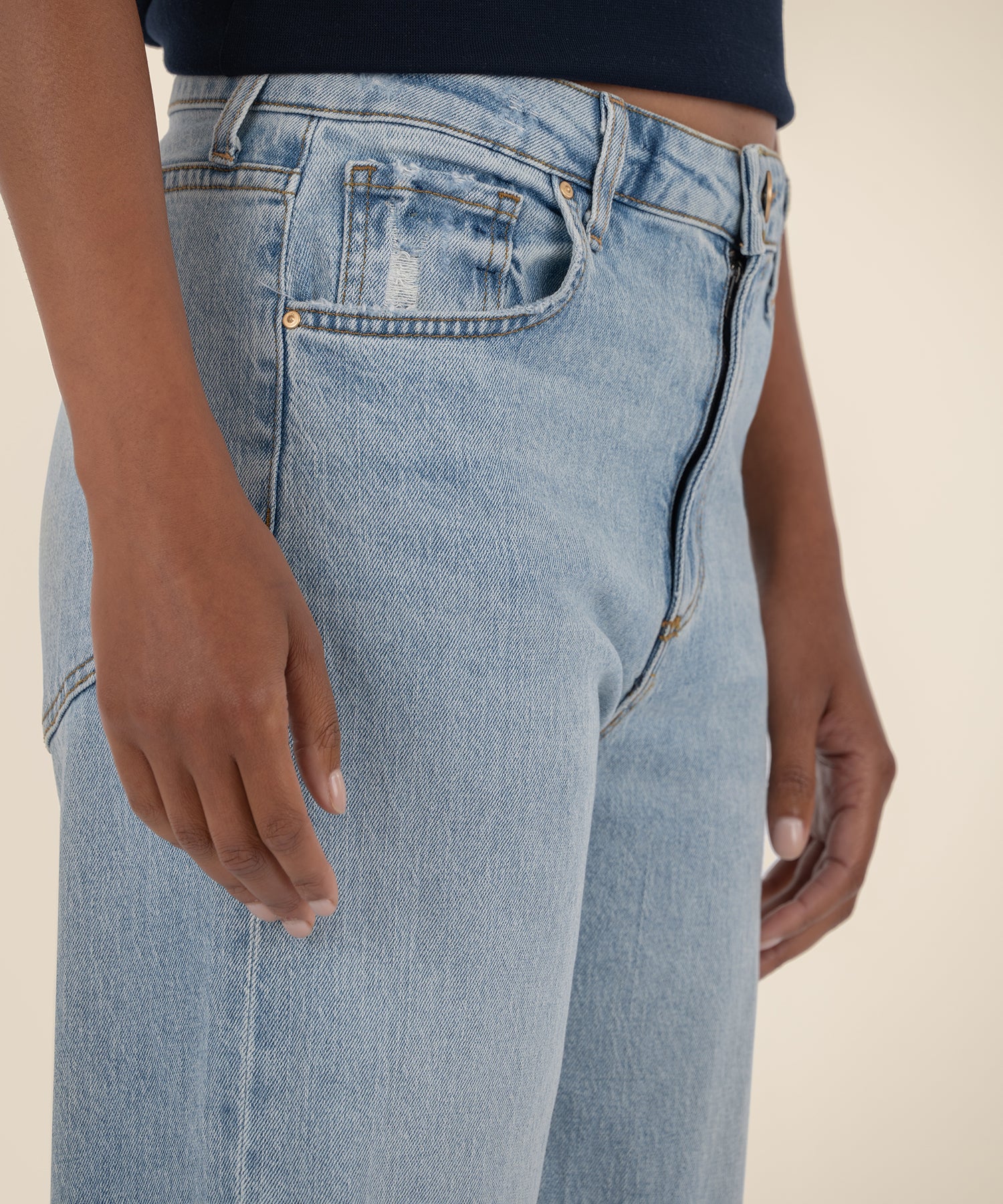 - Crafted in the USA these high-rise, straight-leg jeans feature a slouchy barrel fit and a touch of distressing for laid-back edge. With a medium wash and just a light amount of stretch, they offer effortless style with a relaxed vibe.