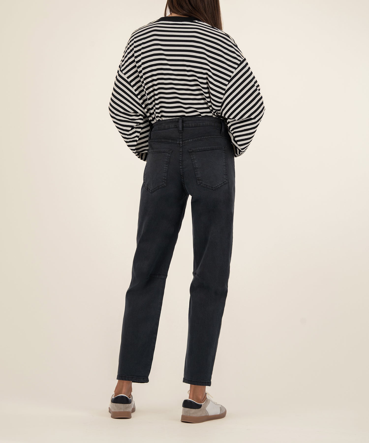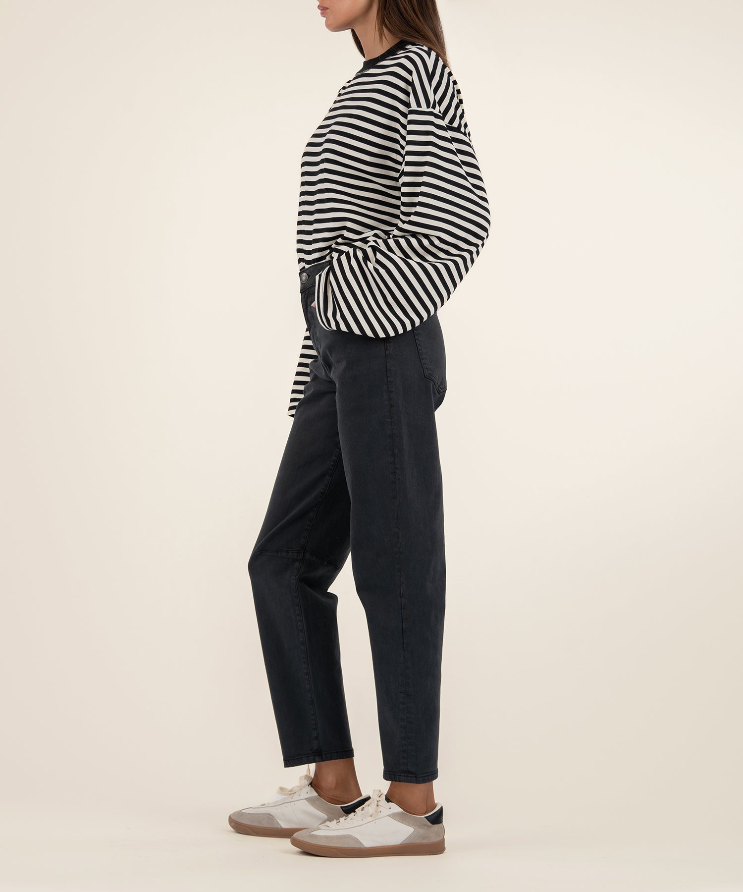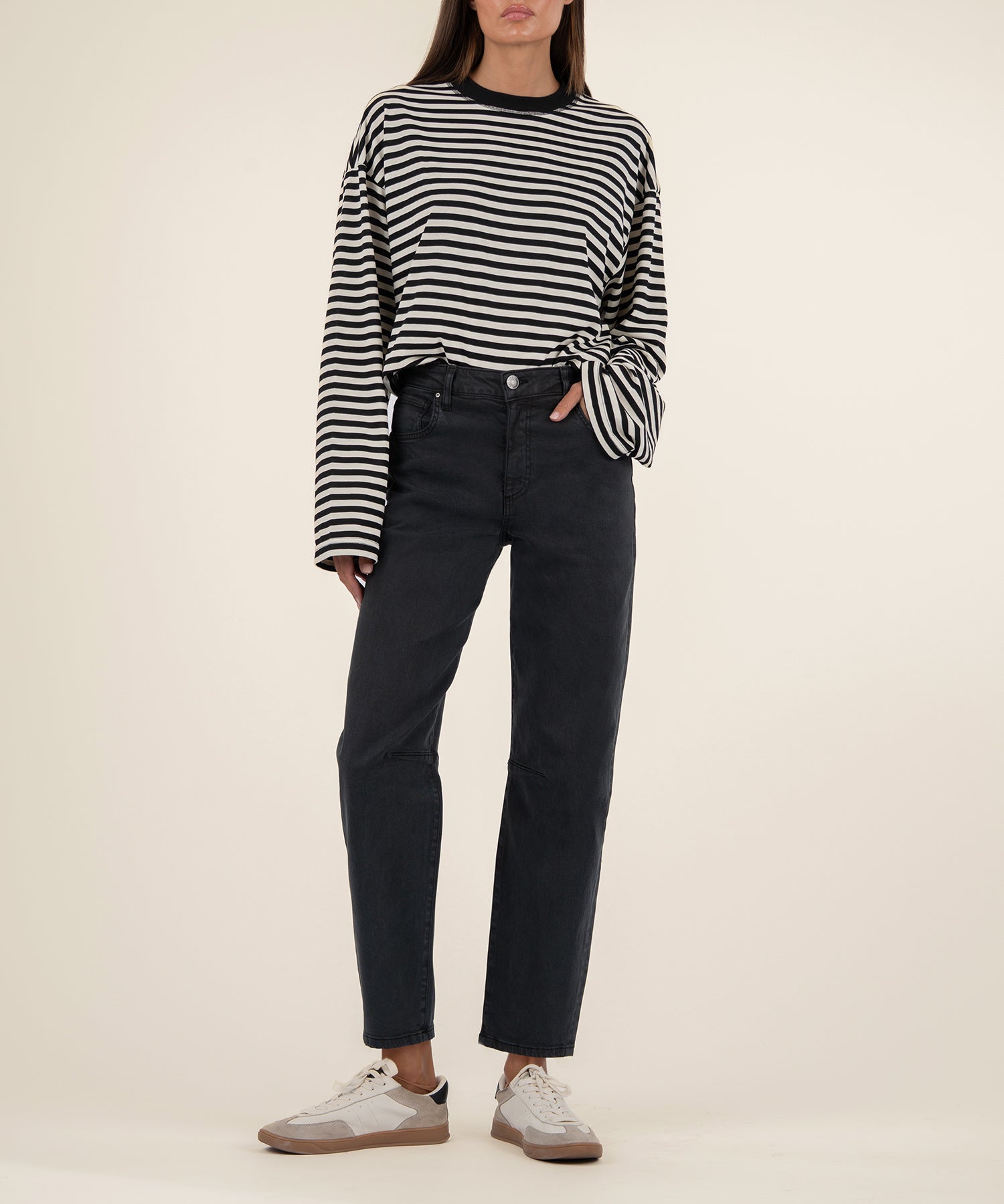 - Elevate your denim collection with these high-rise slouchy barrel leg jeans in a sleek black wash. Made from super stretchy material, they offer all-day comfort without sacrificing shape or style. The relaxed barrel leg and flattering high waist create a modern, laid-back silhouette perfect for any occasion.