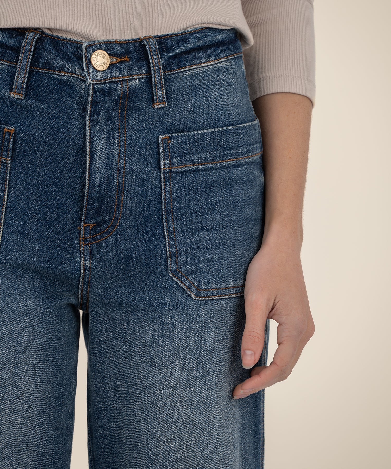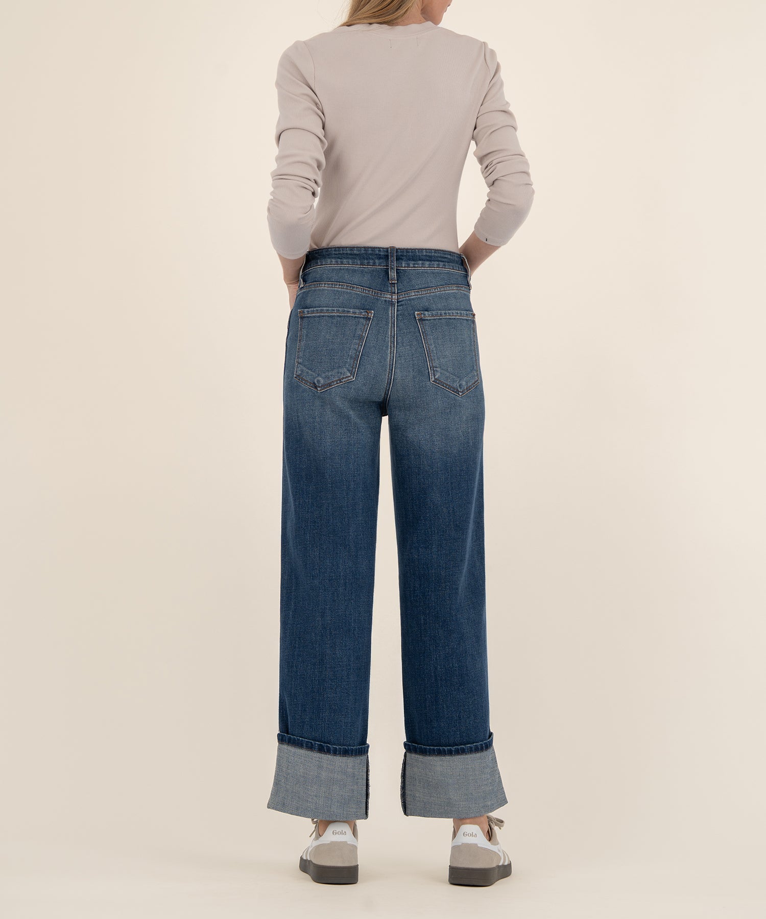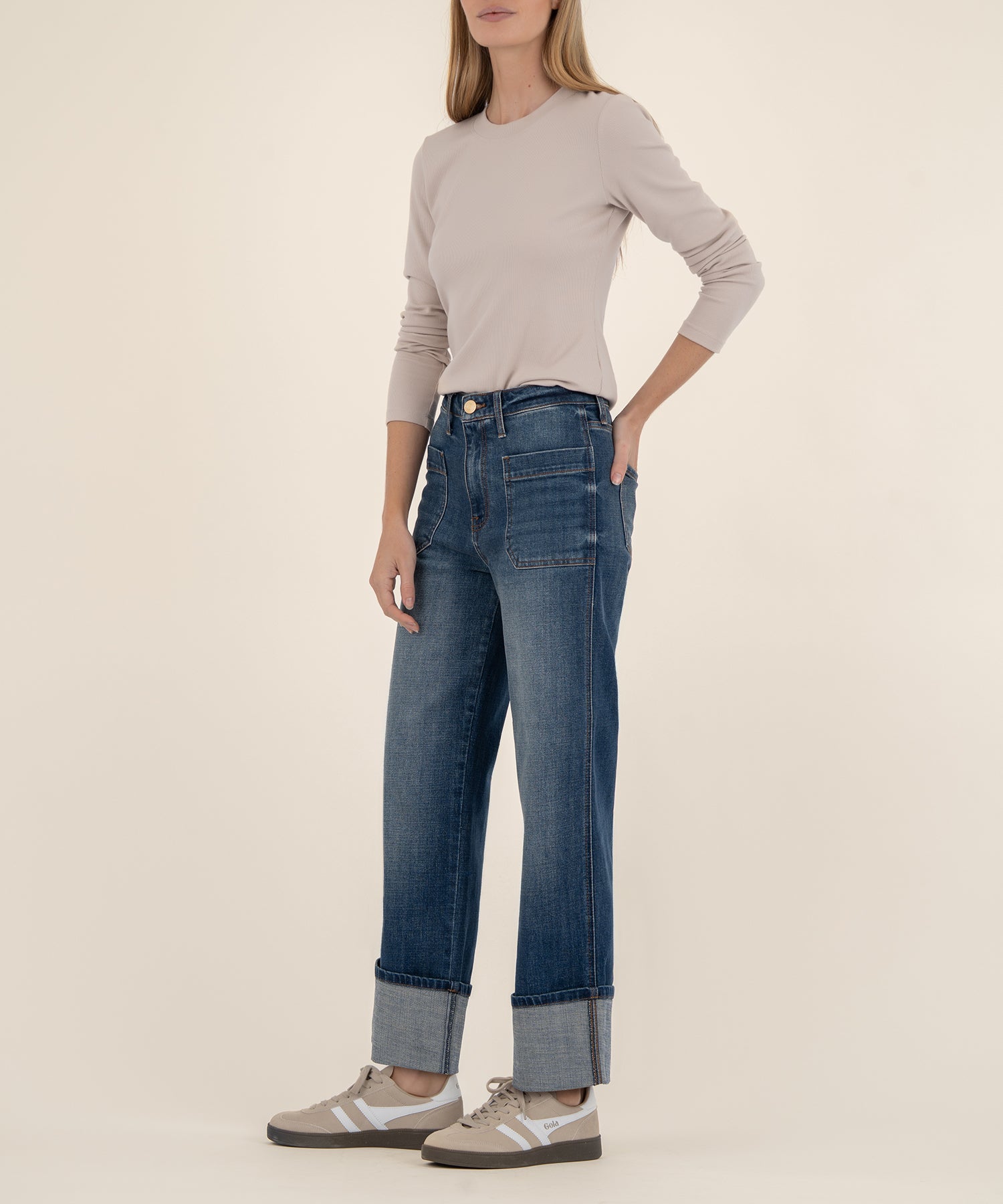 - Timeless meets modern in these high-rise straight leg Jeans in a classic dark wash. Designed with flattering patch pockets and casual roll-up hems, they offer effortless style and everyday comfort.