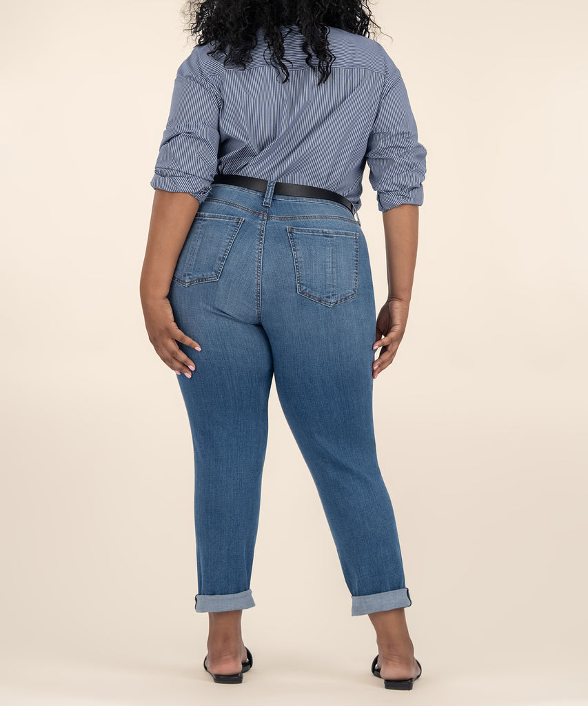 • These med-rise boyfriend jeans in a classic medium wash feature stretchy material for ultimate comfort. Roll up or roll down to enjoy versatile styling options.