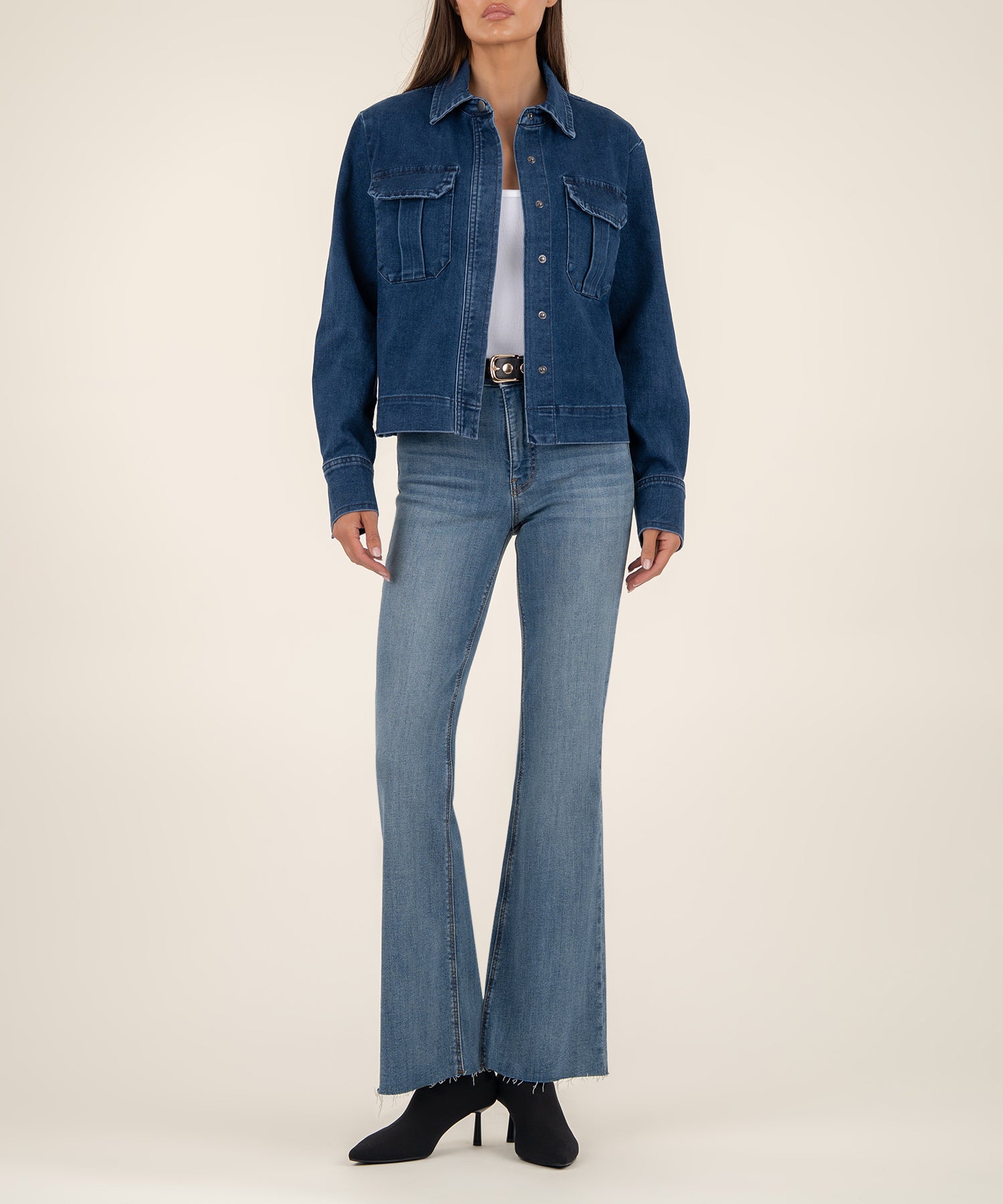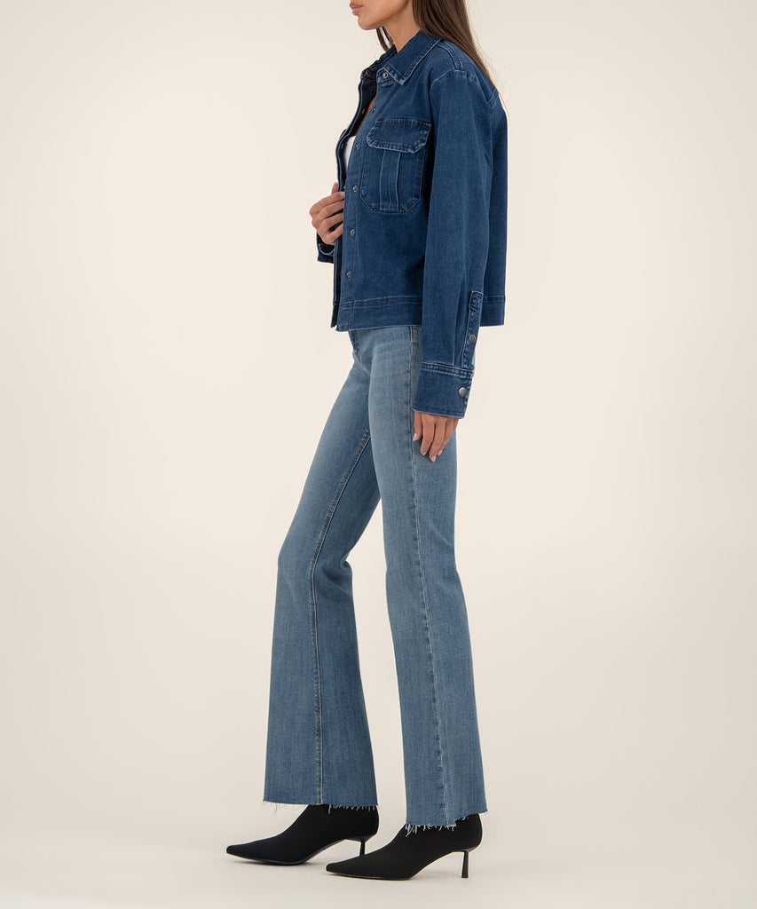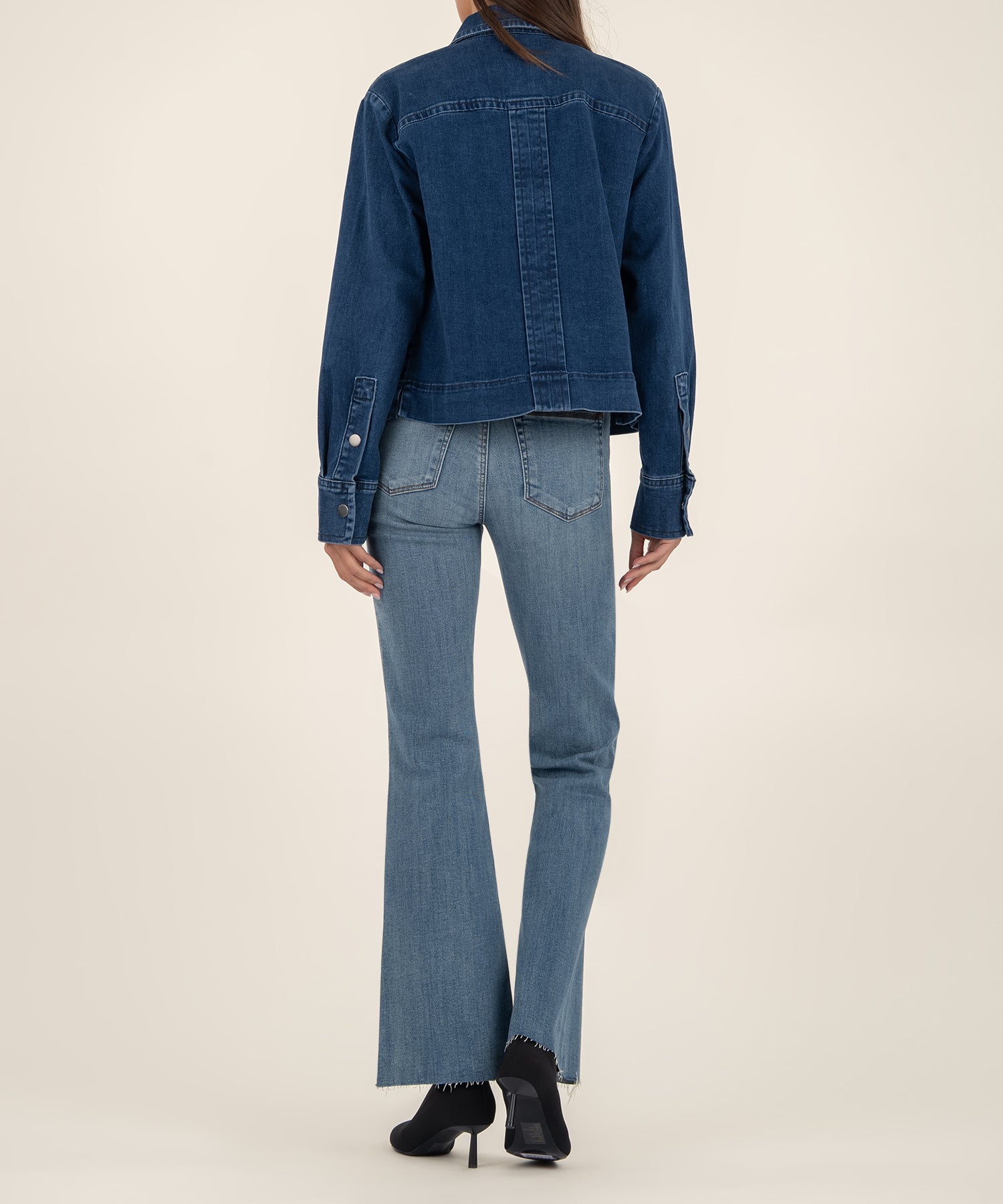 - This jacket features patch pockets with flaps and a hidden placket with snap button front closure for a clean, streamlined look. An inverted pleat at the back adds subtle movement and a touch of sophistication.
