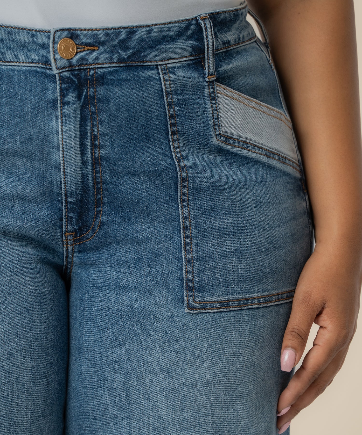 - High-rise jeans in a versatile medium wash, designed with a flattering wide-leg silhouette. Crafted from very stretchy material for all-day comfort and ease of movement, they feature distinctive porkchop pockets with reverse inset detailing that adds a modern, standout touch. Finished with a raw hem, these jeans offer a trendy, effortlessly edgy look.