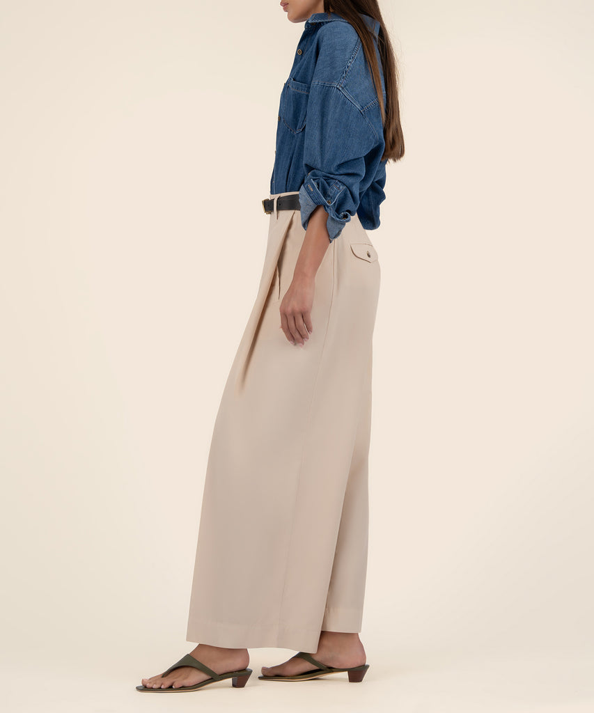 • These high-rise pants feature a classic wide leg cut and structured front pleats, offering a clean, timeless look. Easy to dress up or down, they’re a versatile addition to any wardrobe.