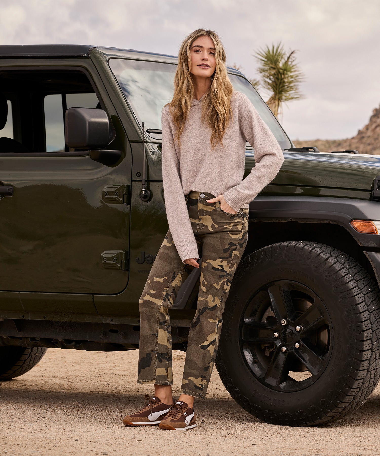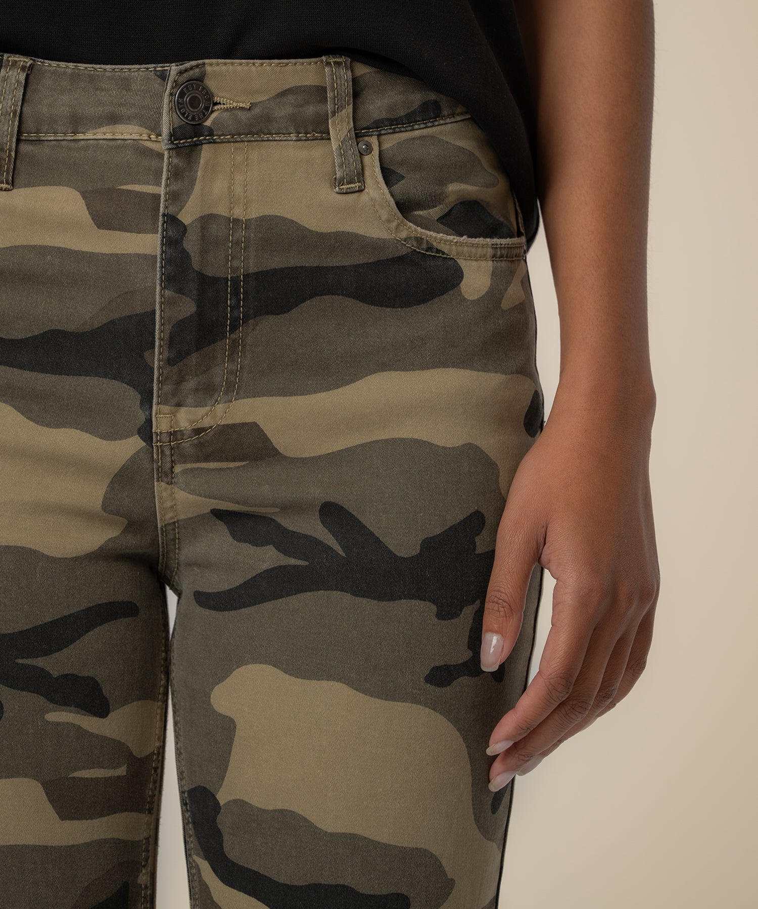 - Stand out in these high-rise ankle flare pants, featuring a bold camo pattern in olive tones for a modern, utilitarian edge. Designed with classic front and back pockets for everyday functionality, they balance practicality with trend-forward appeal. The high-rise fit flatters the waist, while the ankle flare adds a sleek, leg-lengthening finish—making these pants a statement-making addition to any wardrobe.