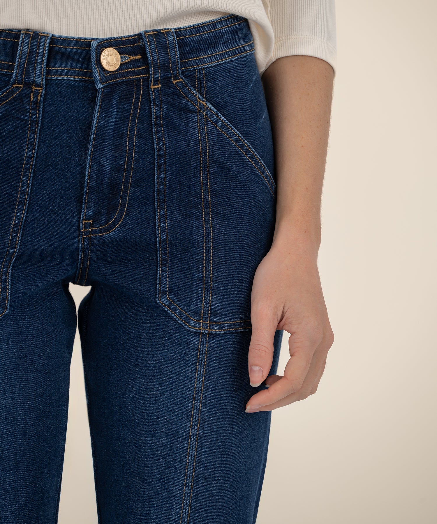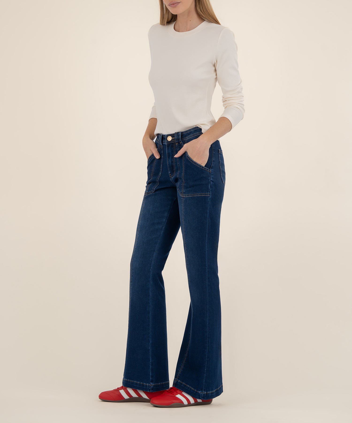 - Step up your style with these high-rise jeans featuring a flattering flare leg, bold porkchop pockets, and a sleek front center seam. Designed to elongate your silhouette and add vintage-inspired edge, they're perfect for day-to-night wear.