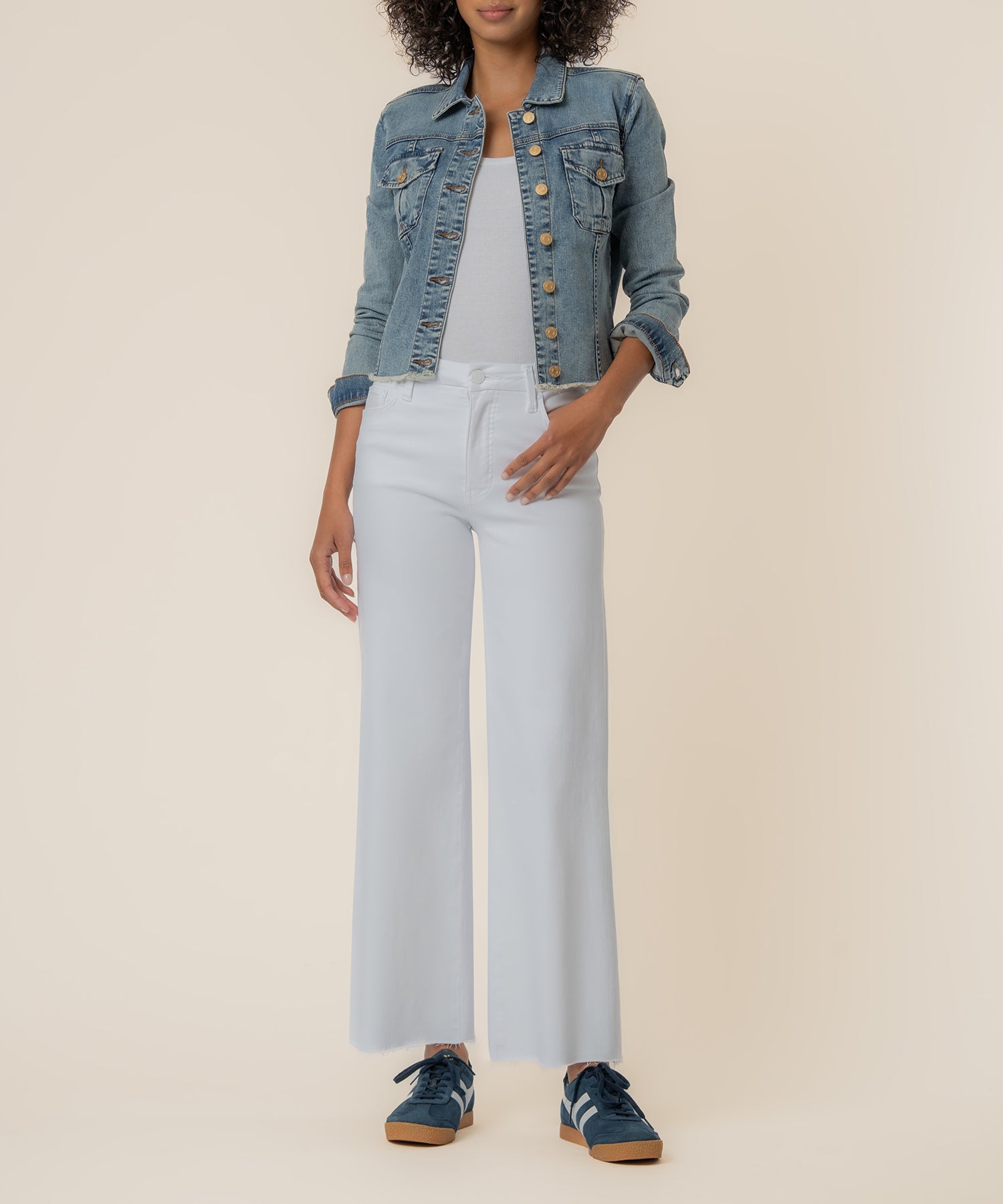 - This denim jacket features a classic medium wash with a modern, waist-free silhouette and a frayed hem for an effortless edge. Designed with a touch of stretch, it offers comfortable movement while maintaining structure. An easy layering piece that adds laid-back style to any look.
