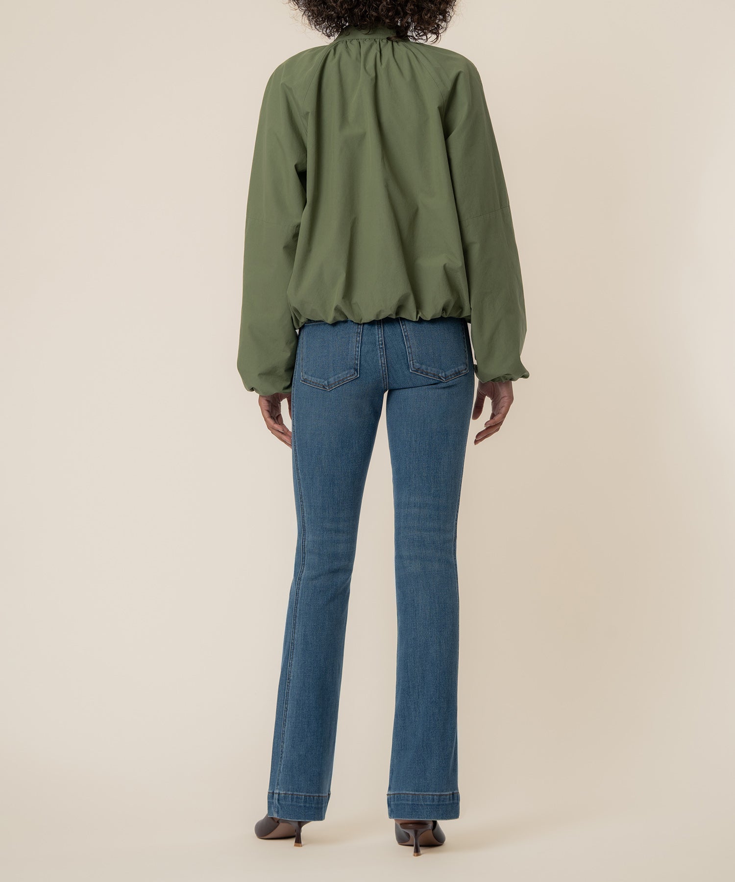 - Elevate your outerwear with this modern bomber jacket, featuring a sleek zip front and subtle shirring around the neckline for a touch of femininity. Designed to strike the perfect balance between polished and relaxed, it offers a refined take on the classic bomber.
