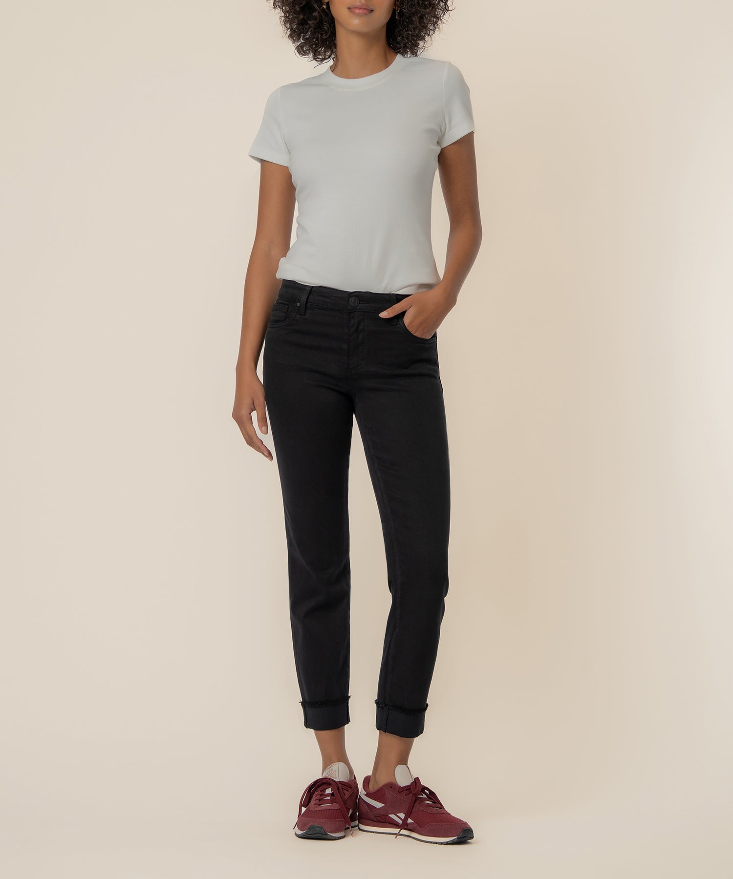- Effortlessly stylish, these pants feature a mid-rise fit with a cropped straight leg. The roll-up frayed hem adds a relaxed touch, while the stretchy material ensures comfort all day long.