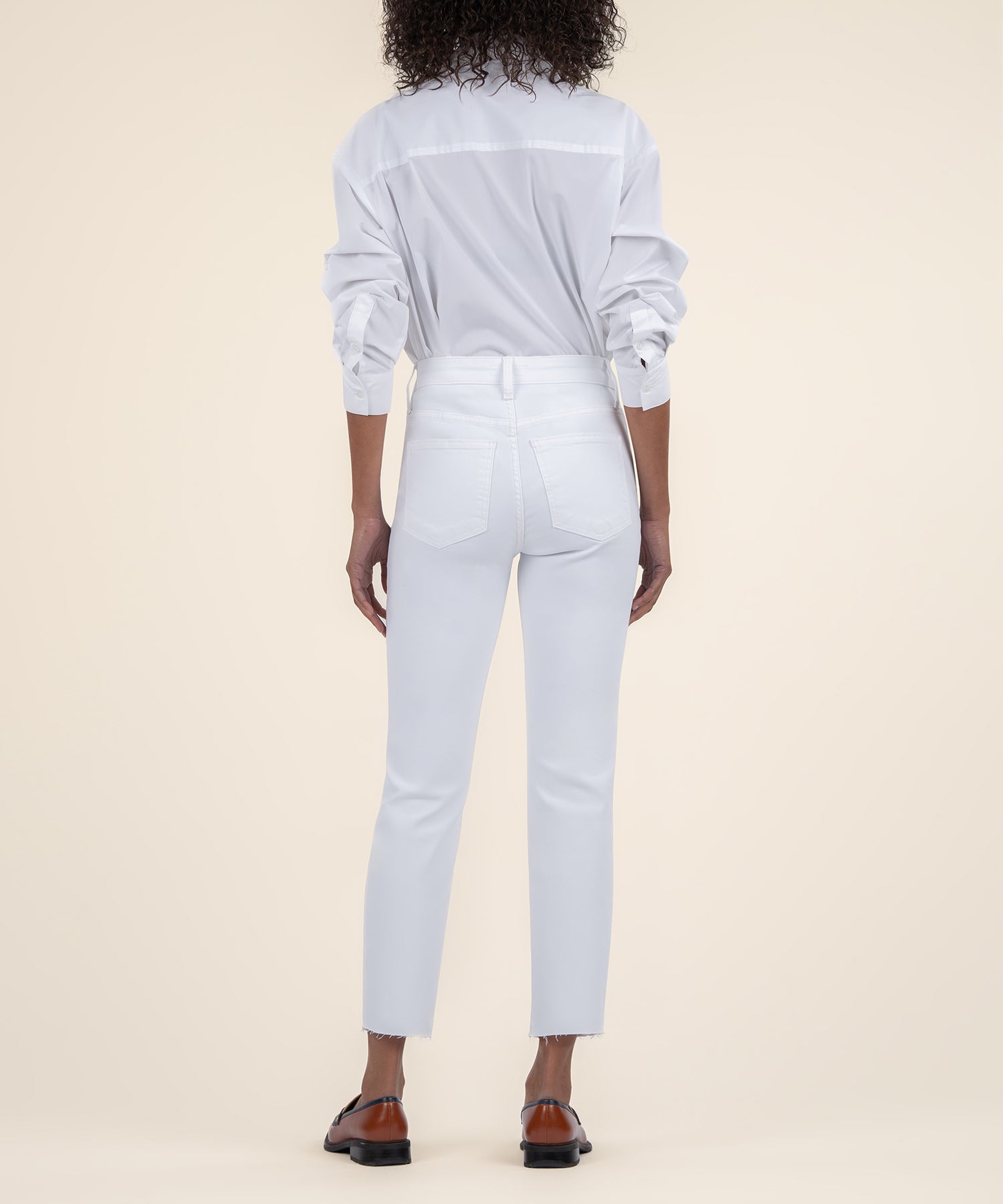 - These bright-white mom jeans offer a fresh, modern take on a relaxed silhouette, with a high-rise fit that feels as good as it looks. Fab Ab front pockets gently shape and smooth for a flattering finish, while the raw hem adds just the right edge. Made from low-stretch denim, they hold their shape while keeping your look effortlessly polished.