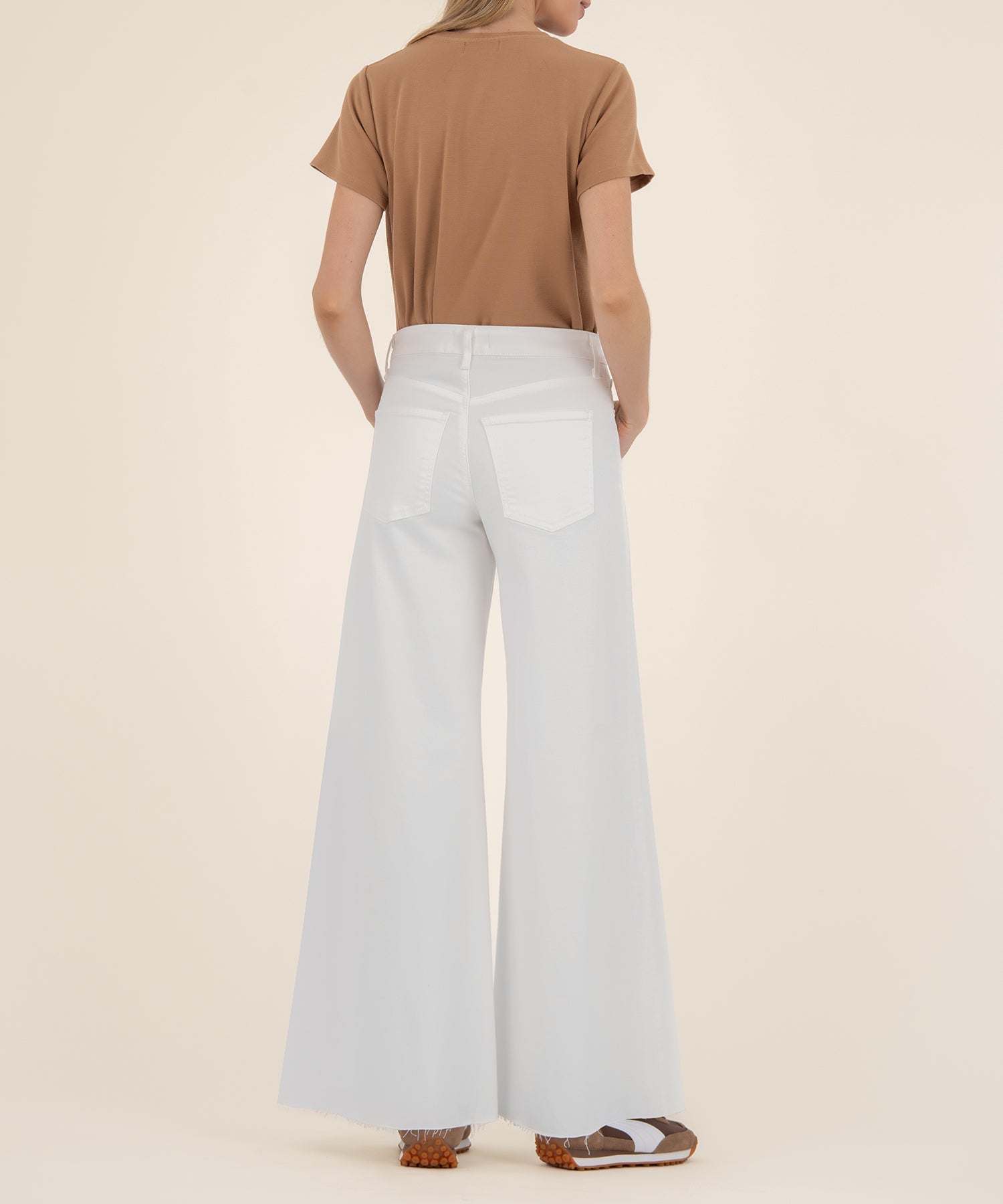 - Brighten up your look with these high rise, super wide leg jeans in crisp snow white. Designed with Fab Ab pockets for a flattering silhouette and raw hems for a touch of edge, they’re made from stretchy material that keeps you comfortable and confident all day.