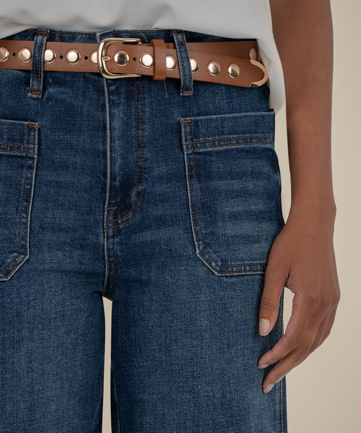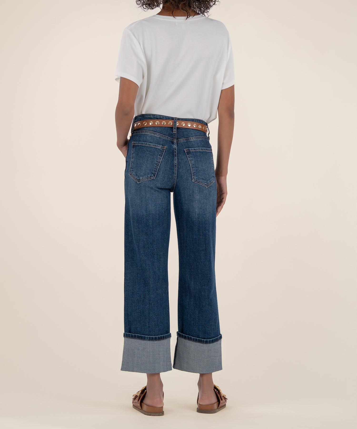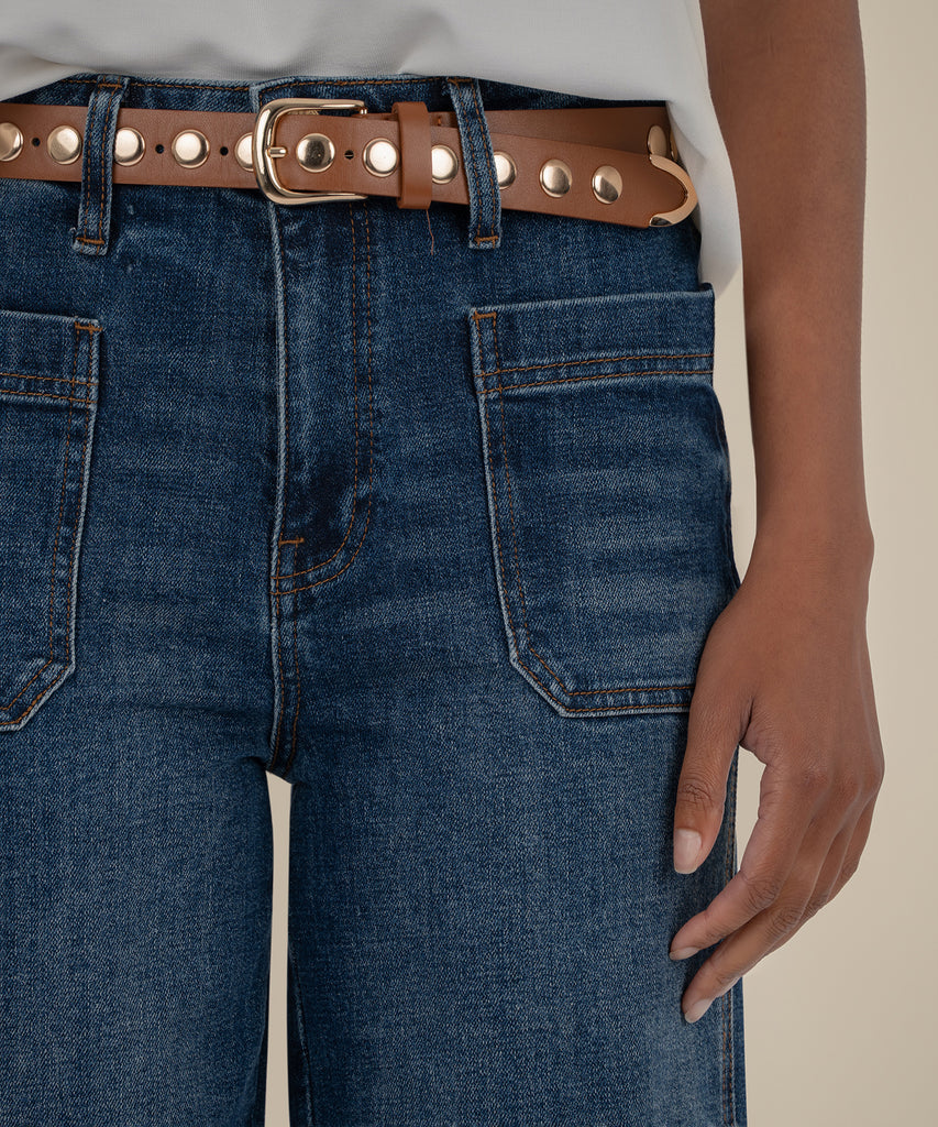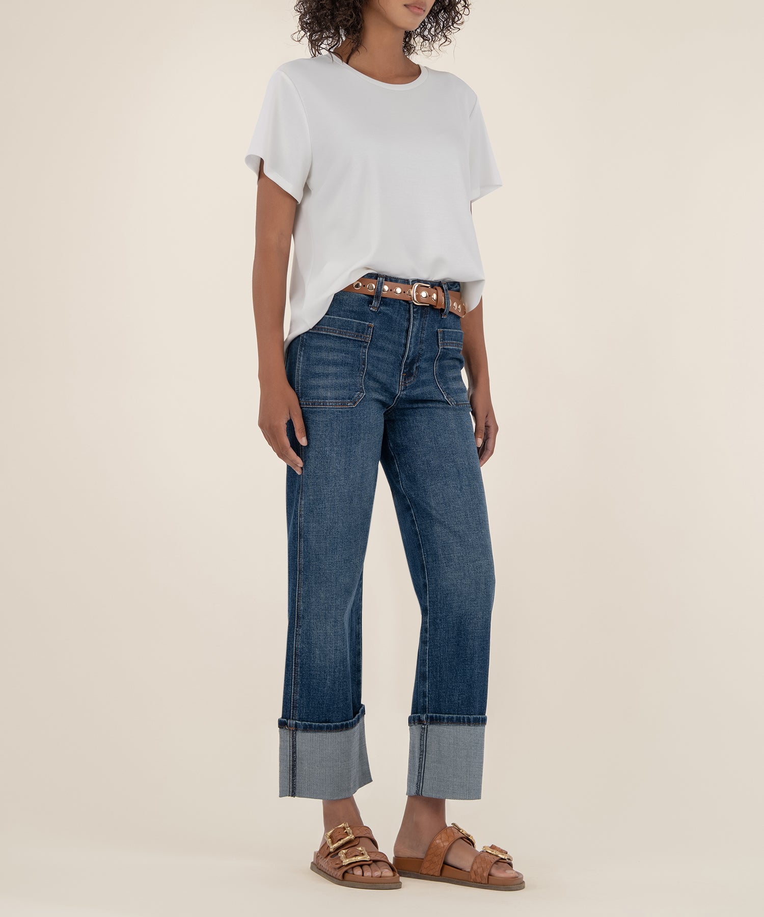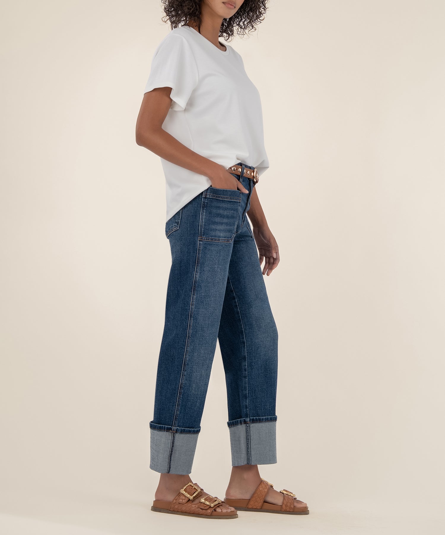 • Timeless meets modern in these high-rise straight leg Jeans in a classic dark wash. Designed with flattering patch pockets and casual roll-up hems, they offer effortless style and everyday comfort.