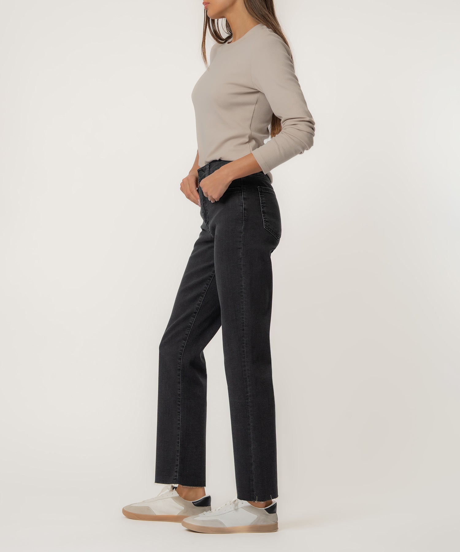 - Step into effortless cool with these high-rise black wash jeans, designed with signature Fab Ab pockets that flatter and shape. The easy straight leg and edgy raw hem create a relaxed vibe, while the stretchy fabric ensures all-day comfort. Perfect for when you want to keep it laid-back but make a statement.