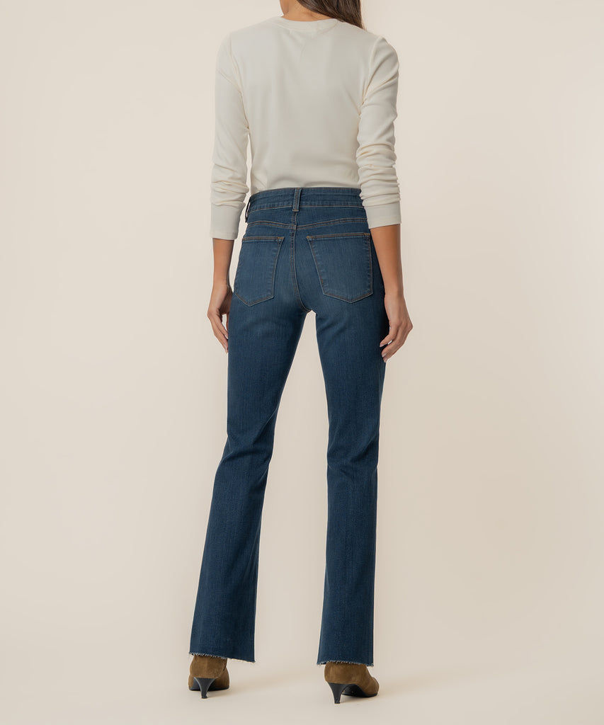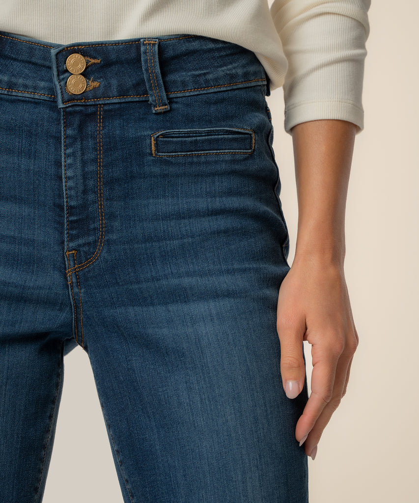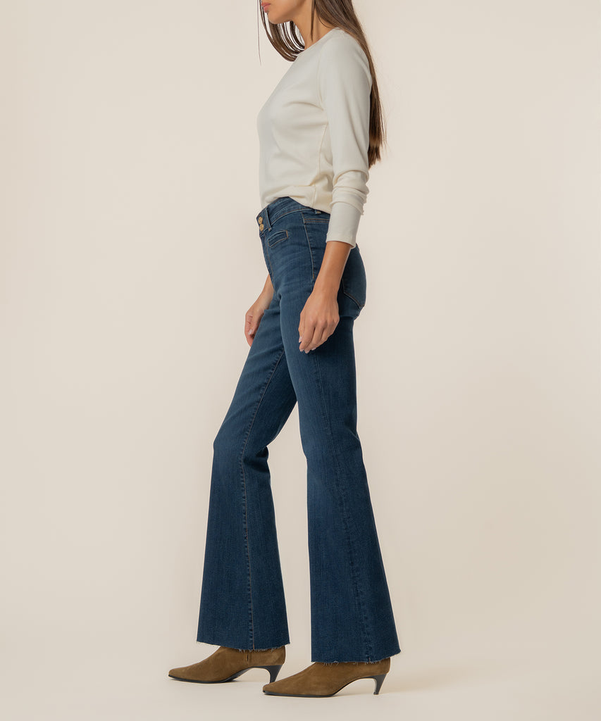 - These high-rise flare jeans are the perfect blend of vintage style and modern comfort. Featuring a dark wash, sleek welt pockets, and a trendy raw hem, they’re finished with a flattering double button closure for added support and style. Crafted from stretchy material, they move with you while keeping their shape all day.