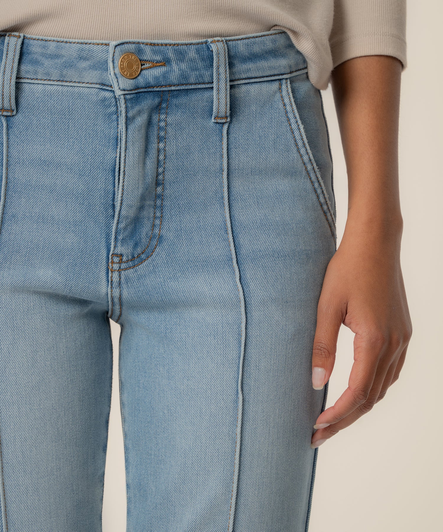 - Elevate your denim game with these high-rise flare jeans, designed with Fab Ab front pockets for a smooth, flattering fit. Crafted in a super stretchy, medium wash denim, they feature a front pin tuck detail that elongates the legs and adds a touch of polish. Perfect for day-to-night style with built-in comfort and shape-enhancing design.