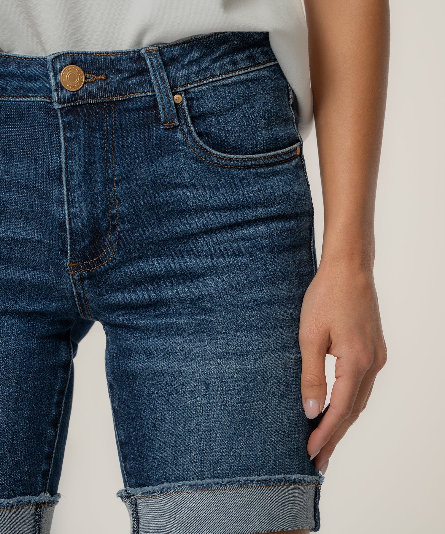 - Upgrade your casual style with these boyfriend shorts in a classic dark wash. Made from very stretchy material, they deliver all-day comfort with a relaxed fit. The distressed details and roll-up frayed hem add the perfect touch of laid-back, lived-in style.