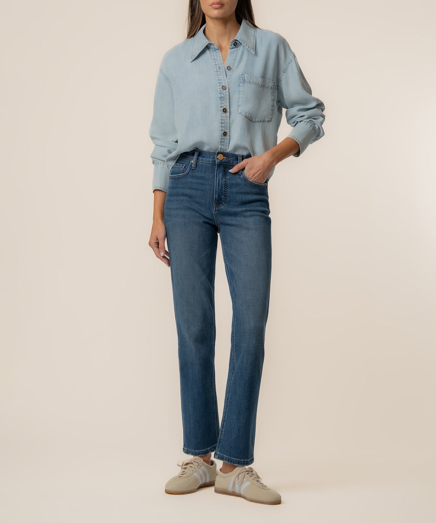 - This light wash denim shirt features a classic button front, long sleeves, and a functional pocket. An easy, versatile staple great for layering or wearing on its own.